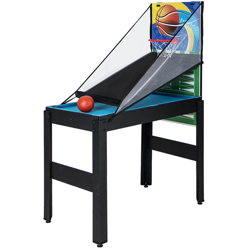 Add a playful touch to your interior space with the Costway 14 in 1 Game Table Play Set. This game table set comes with seven ball games including basketball, billiard, football, table tennis, shuffleboard, bowling and hockey. It also includes chess, checkers, ring toss, horseshoes, poker, backgammon and tic tac toe. It features well-made players, a convenient goal box and a scoreboard with non-slip handles for an exciting football game with family and friends. The smooth and scratch-resistant billiard felt offers a great playing surface for maximum enjoyment. The sturdy backboard and hoop can withstand thousands of shots. The stackable tabletop design ensures flexible transformation between games and is ideal for easy storage. You can enjoy multiple games on one table without sacrificing much floor space. It is crafted using premium materials for durability and longevity. The thickened legs with adjustable foot pads provide stable support on any surface. This game table helps develop hand-eye coordination and motor skills while promoting parent-child interaction.
