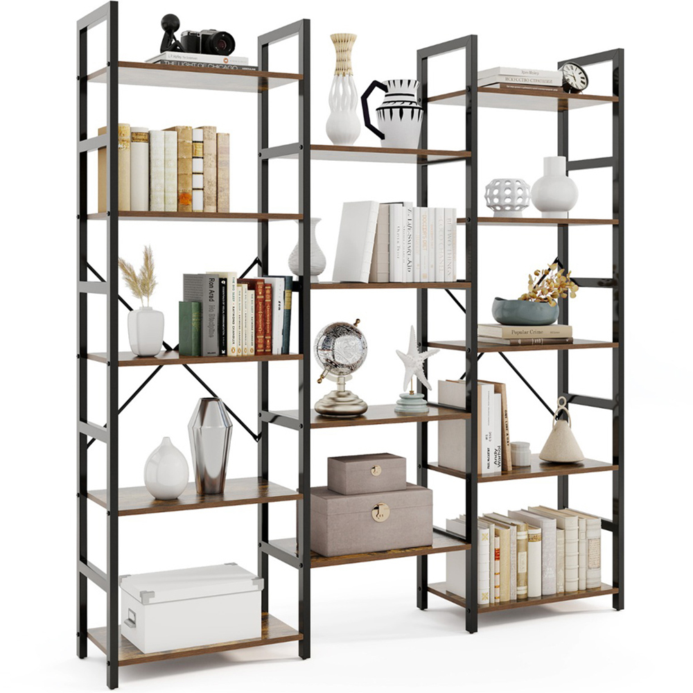 Elevate your interior with the Triple Wide Heavy-duty Metal Frame Industrial Bookshelf, a robust and stylish storage solution that transforms any room into an organized, airy space. With its 14 open shelves, this bookshelf offers ample room to display books, plants, and decorative items, while the industrial metal frame supports an impressive total load capacity of 420 kg. The rust-resistant powder coating and safety features, including anti-toppling devices and an X-reinforcement bar, ensure durability and stability. Adjustable foot pads allow for setup on uneven surfaces, protecting floors from scratches. This versatile bookshelf combines functionality with a rustic industrial aesthetic, making it an ideal choice for any home or office.