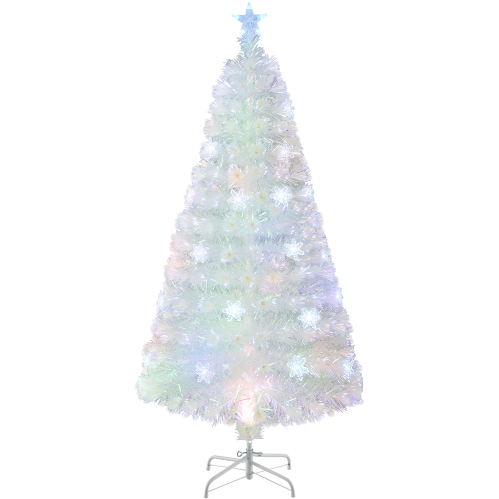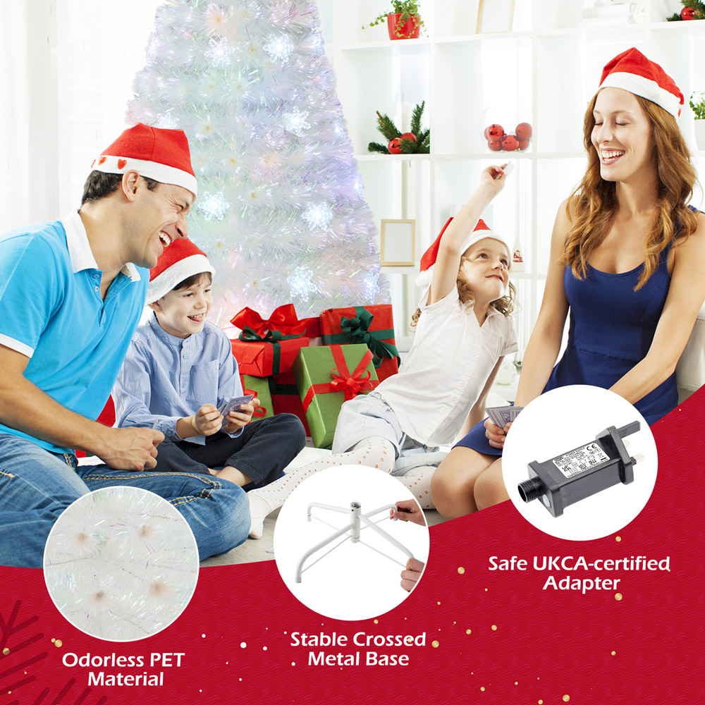 Step into a magical winter scene as the fibre optic white Christmas tree brings festive cheer with its iridescent leaves, colourful snowflake-shaped LED lights and a glowing top star that shines bright in any setting. Crafted from PET material, the tree is non-allergenic and keeps its vibrant look year after year, while the stable metal base with non-slip pads ensures it stands securely and keeps your floors safe from scratches. Whether you're decorating your home, office or shop, this pre-lit artificial tree creates a captivating centrepiece that everyone will admire.