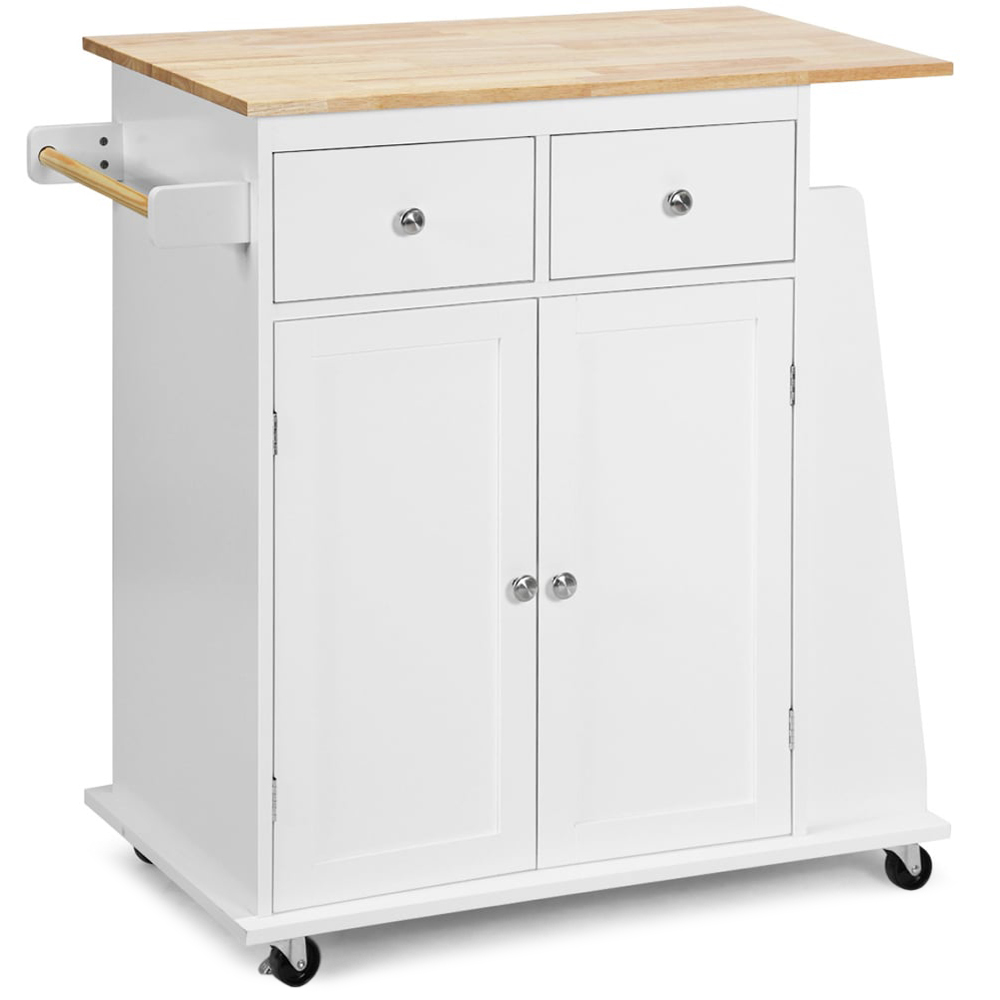 Make a stunning and practical addition to your kitchen accessory collection with the Costway 2 Door 2 Drawer White Kitchen Island Trolley. It is equipped with a wide solid wood countertop, a two-door cabinet, two drawers, a towel rack and a three-tier spice rack. It provides sufficient storage space for your kitchenware and can make it well organised. The shelf inside the cabinet can be adjusted to three different positions to meet diverse storage needs. The towel rack on the side can also be used as a convenient pushing handle. It is crafted using solid rubber wood and sturdy P2 MDF for stability and durability. It features four universal wheels with two lockable wheels and is easy to move or secure in any place according to your preference. The modern and simple design makes it a great decoration in your kitchen, dining room and living room. This rolling trolley cart features a modern simple design and natural wood grain tabletop. The surface is sprayed with premium paint, making it smooth, wear-resistant, waterproof and easy to clean with a damp cloth. All the parts, hardware and detailed instructions are included in the package for easy assembly.