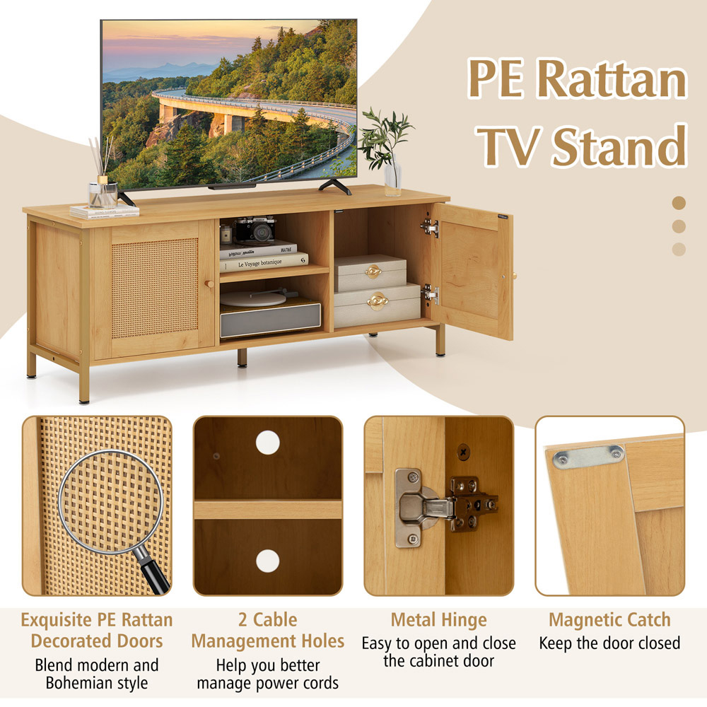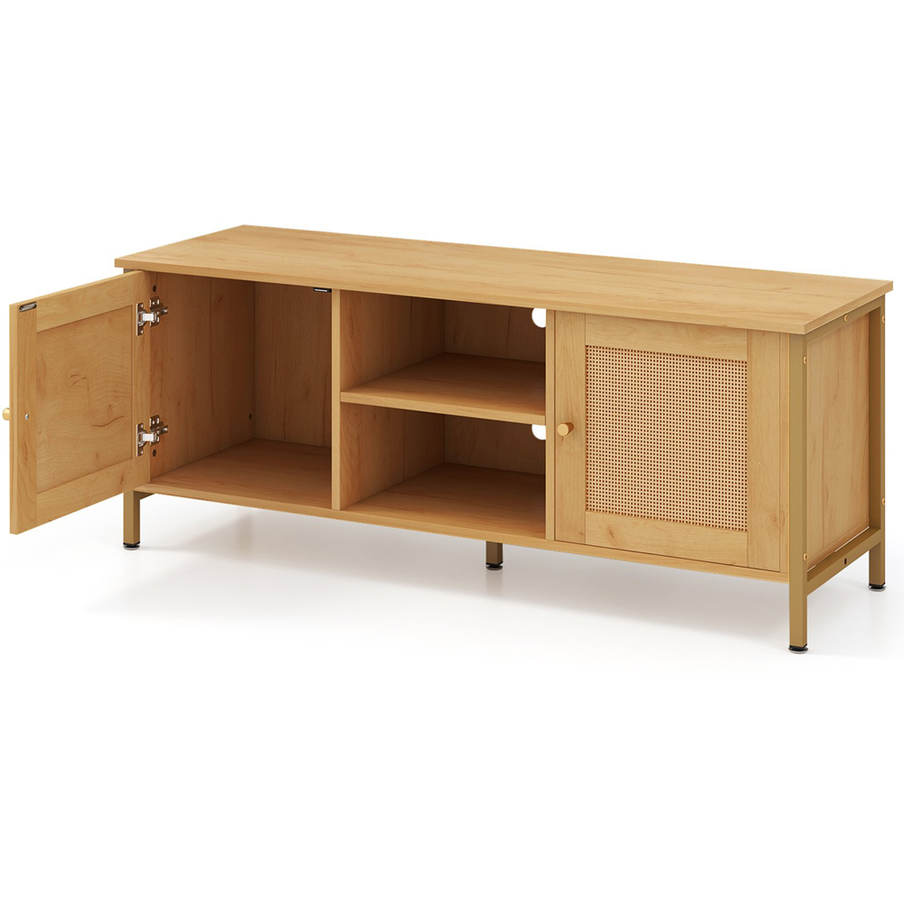 Transform your abode with the Costway 2 Door 2 Shelf Natural Boho Rattan TV Unit. This beautiful piece combines the warmth of oak wood grain with the beauty of natural PE rattan weaving, enhancing the aesthetic appeal of your space. The PE rattan TV stand is an eye-catching addition to your bedroom, living room, or entryway. It can accommodate flat-screen TVs up to 55 inches, with a large tabletop measuring 120 x 40cm. The spacious tabletop provides storage and display space for ornaments, vases, books, and more. The two-tier open shelf and two cabinets offer ample storage space for DVD players, remote controls, game consoles, and other daily items, helping to keep your home well-organized. The boho media console table is made of durable engineered wood and is supported by five powder-coated metal legs, providing stability and quality. Adjustable foot pads ensure stability on slightly uneven floors. The back of the entertainment centre features two cable management holes, and the metal hinge makes it easy to open and close the cabinet door.