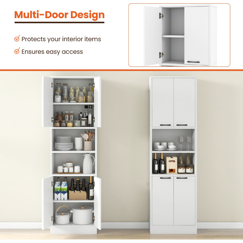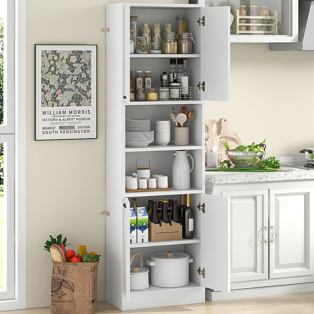 Maximise your storage while minimising floor space with this sleek tall freestanding cupboard. Designed to serve multiple purposes, it functions beautifully as a buffet cabinet, kitchen cupboard, coffee bar, display cabinet, or even a bathroom cabinet. The multi-door design not only enhances accessibility but also ensures that your items are kept dust-free and neatly organised. With its robust construction and anti-toppling system, this cupboard promises stability and safety, making it an essential addition to any home.