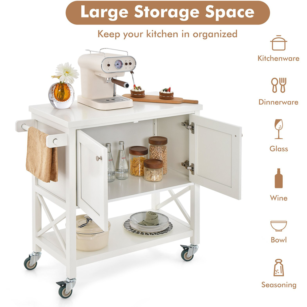 Enhance your home's functionality and style with the Costway 2 Door Single Shelf White Kitchen Island Trolley. It features a storage cabinet, towel rack, and spice rack in a pristine white finish. Perfect for any room from the kitchen to the living room, this versatile unit offers a solution to your storage woes while adding a touch of elegance. With its ample storage space, including a wide countertop and a large cabinet, it's ideal for organizing kitchenware, dinnerware, and more. The cart is designed for easy mobility, equipped with four universal wheels, two of which are lockable for stability. Made from MDF board, it promises durability and ease of maintenance, ensuring a long-lasting addition to your home.