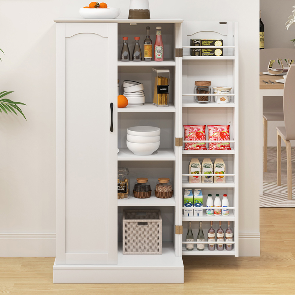 Maximise your kitchen's functionality with the sleek 12cm Kitchen Pantry Cabinet, featuring a robust white finish that complements any decor. This cabinet is a storage powerhouse with a total of 17-tier shelves, including 5-tier inside and 12-tier side racks, all adjustable to tailor to your storage needs. The inclusion of two anti-toppling devices enhances safety by securing the unit firmly to the wall, ensuring it remains stable and secure even when fully loaded. Designed for durability, the high-quality board construction promises long-lasting use, while the assembly process is straightforward, making it easy to set up. This versatile cabinet not only optimizes kitchen space but also adds a touch of elegance, suitable for various uses around your home or office.