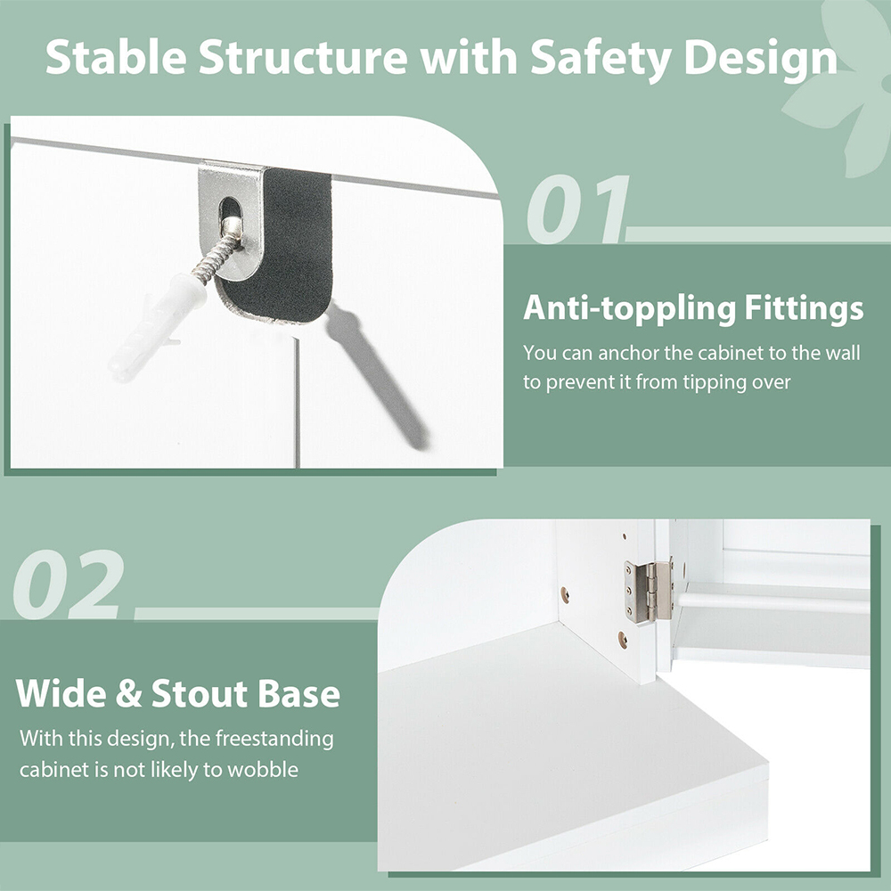 Upgrade your kitchen with the Costway 2-Door White Pantry Cabinet with 6 Adjustable Shelves. This floor cabinet with two six-tier shelves and a five-layer compartment maximizes your kitchen space, adding an elegant finish. This multi-tier shelved design helps you to easily sort diverse items and maintain an organized kitchen. The six three-position adjustable shelves are evenly located inside for customized arrangement. The cabinet is made from high-grade MDF and performs excellent sturdiness by holding up to 70kg weight. The wooden base at the bottom increases the touching area with the ground while the non-toppling device fastens itself firmly to the wall. It features a polished and painted surface that has a distinctive shine when illuminated by light, making the kitchen cupboard look more exquisite. The clearly labelled instructions make it easy to assemble the cabinet.