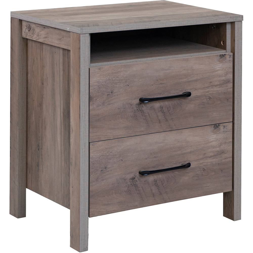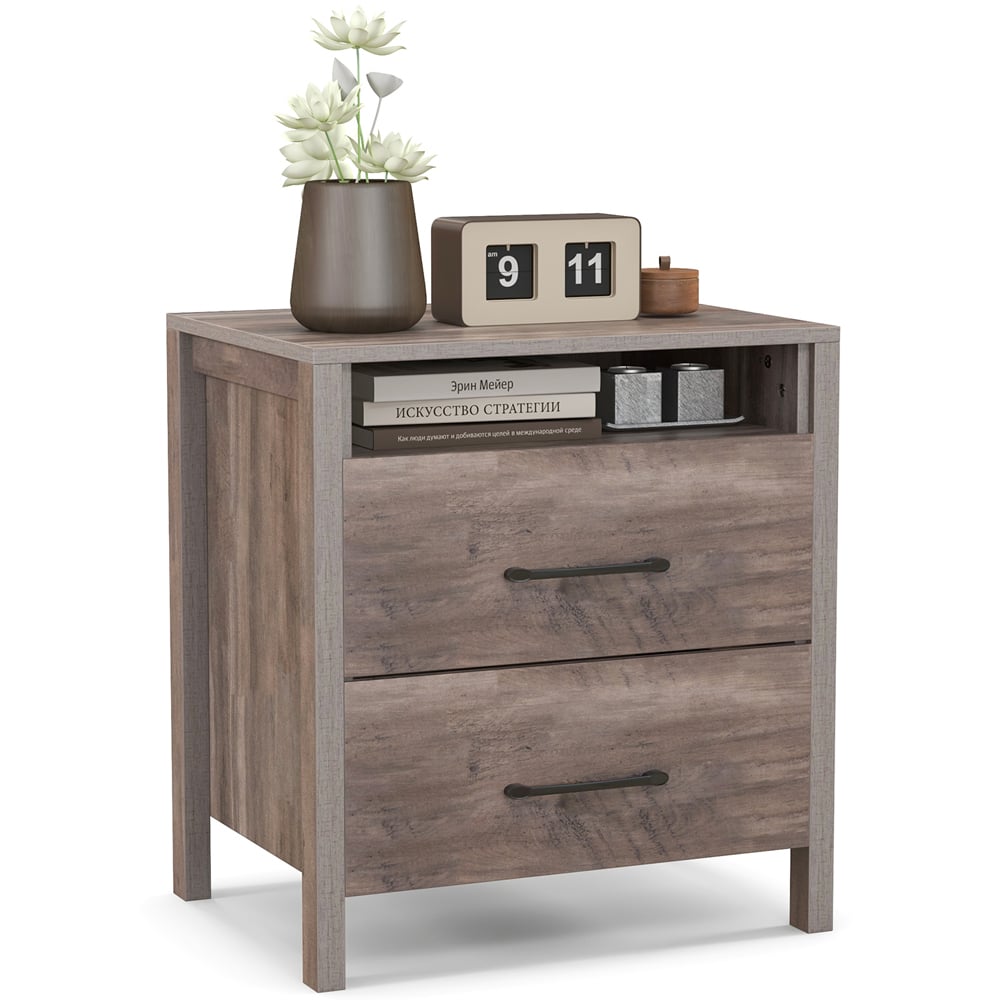 Elevate your bedroom's style and functionality with the Costway 2 Drawer Grey Farmhouse Bed Side Table. Featuring a spacious tabletop, two large drawers, and an open shelf, this piece offers ample storage to declutter your space. Whether used beside your bed or as a sofa side table, its versatile design and non-slip foot pads ensure stability and scratch-free floors, making it a perfect addition to any room. This grey-coloured farmhouse nightstand brings a touch of rustic charm with its vintage wood grain finish.