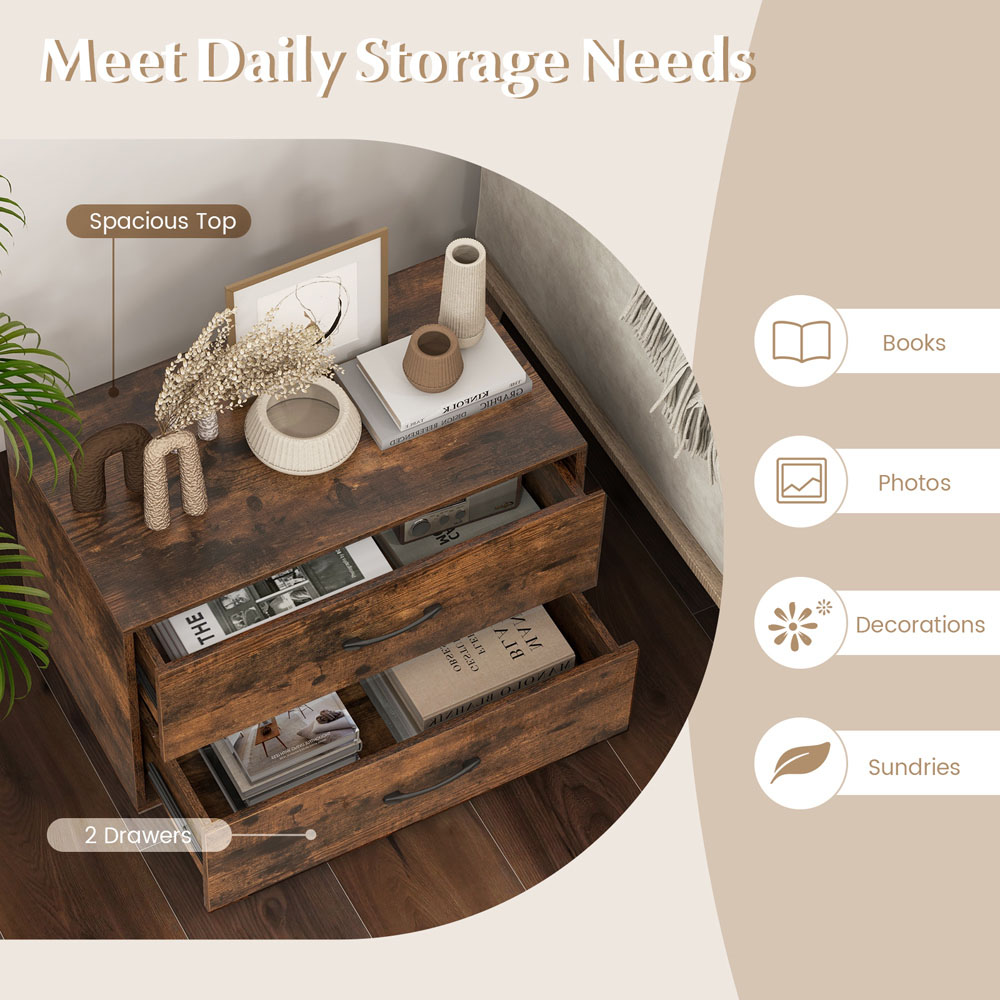 Elevate your space with the rustic brown stackable 2-drawer dresser, designed to blend seamlessly into any room whilst offering exceptional functionality. This versatile storage solution, perfect for the living room, entryway, or office, features metal handles and smooth sliding rails for easy access. The spacious drawers and tabletop provide ample room for essentials and decorative items alike. With the ability to stack up to three units, this dresser not only saves space but also allows for a tailored storage setup. Enhanced with anti-scratch pads and anti-tipping devices, it ensures both stability and the longevity of your floors.