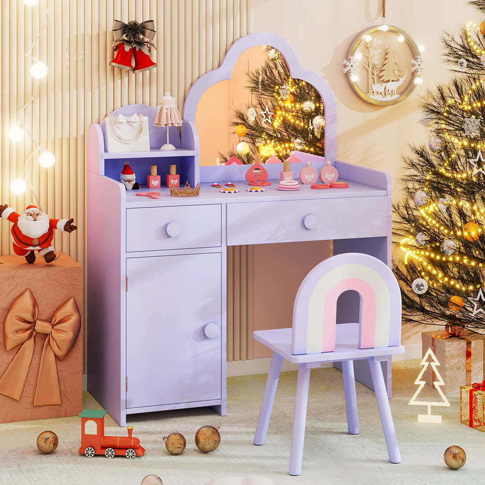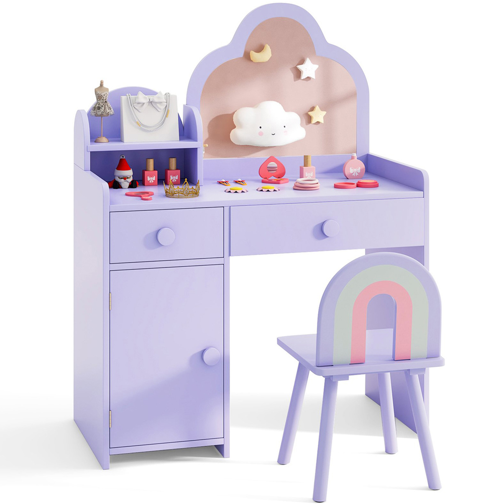 The vanity set is designed with a large cloud-shaped mirror for kids to enjoy their beauty. The mirror is made of safe and shatterproof acrylic for high safety. Meanwhile, the dressing table features 1 open shelf, 1 desktop, 1 cabinet, and 2 drawers to organize kid's jewellery and makeup tools. The top can be removed to transform the vanity table into a writing desk. Additionally, the stool with a curved backrest makes kids feel comfortable. The anti-toppling system helps the table remain stable, while the solid wood legs with foot pads keep the chair steady and not easy to wobble. More importantly, the vanity set is BSEN approved. Cloud-shaped Vanity Mirror: The stylish cloud-shaped mirror offers kids a large view, allowing them to observe their hairdos and faces for convenient makeup. Plus, the shatterproof acrylic mirror also ensures a safe makeup experience. Versatile Table with Storage Space: The top of the table can be moved away when not in use, so that kids can use it as a dressing table or a study desk. Moreover, the vanity table has 1 open shelf, 1 spacious desktop, 1 single-door cabinet, and 2 storage drawers to store kids' cosmetics and jewellery. Comfortable and Sturdy Kids Chair: The vanity set also comes with a matching stool. The curved backrest and smooth seat offer kids a comfy sitting experience. Supported by 4 solid pine wood legs, the stool can perfectly support kid's body. Anti-slip foot pads increase overall steadiness. Stable and Reliable Construction: Crafted with high-quality MDF, the kids vanity set allows for excellent stability and a long-lasting lifespan. The anti-toppling design can secure the vanity table to the wall for enhanced safety and stability. The rounded corners and splinter-free edges protect children from getting scratched. Adorable Gift for Little Princesses: Featuring cute cloud-shaped design and beautiful colours, the dressing table and chair will be a perfect gift for 3-7 years old kids. It also complies with BS EN. The vanity set is a wonderful addition to kids' room, bedroom, play room, and more.