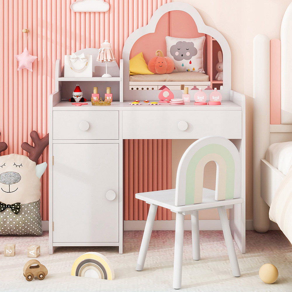 The vanity set is designed with a large cloud-shaped mirror for kids to enjoy their beauty. The mirror is made of safe and shatterproof acrylic for high safety. Meanwhile, the dressing table features 1 open shelf, 1 desktop, 1 cabinet, and 2 drawers to organize kid's jewellery and makeup tools. The top can be removed to transform the vanity table into a writing desk. Additionally, the stool with a curved backrest makes kids feel comfortable. The anti-toppling system helps the table remain stable, while the solid wood legs with foot pads keep the chair steady and not easy to wobble. More importantly, the vanity set is BSEN approved. Cloud-shaped Vanity Mirror: The stylish cloud-shaped mirror offers kids a large view, allowing them to observe their hairdos and faces for convenient makeup. Plus, the shatterproof acrylic mirror also ensures a safe makeup experience. Versatile Table with Storage Space: The top of the table can be moved away when not in use, so that kids can use it as a dressing table or a study desk. Moreover, the vanity table has 1 open shelf, 1 spacious desktop, 1 single-door cabinet, and 2 storage drawers to store kids' cosmetics and jewellery. Comfortable and Sturdy Kids Chair: The vanity set also comes with a matching stool. The curved backrest and smooth seat offer kids a comfy sitting experience. Supported by 4 solid pine wood legs, the stool can perfectly support kid's body. Anti-slip foot pads increase overall steadiness. Stable and Reliable Construction: Crafted with high-quality MDF, the kids vanity set allows for excellent stability and a long-lasting lifespan. The anti-toppling design can secure the vanity table to the wall for enhanced safety and stability. The rounded corners and splinter-free edges protect children from getting scratched. Adorable Gift for Little Princesses: Featuring cute cloud-shaped design and beautiful colours, the dressing table and chair will be a perfect gift for 3-7 years old kids. It also complies with BS EN. The vanity set is a wonderful addition to kids' room, bedroom, play room, and more.