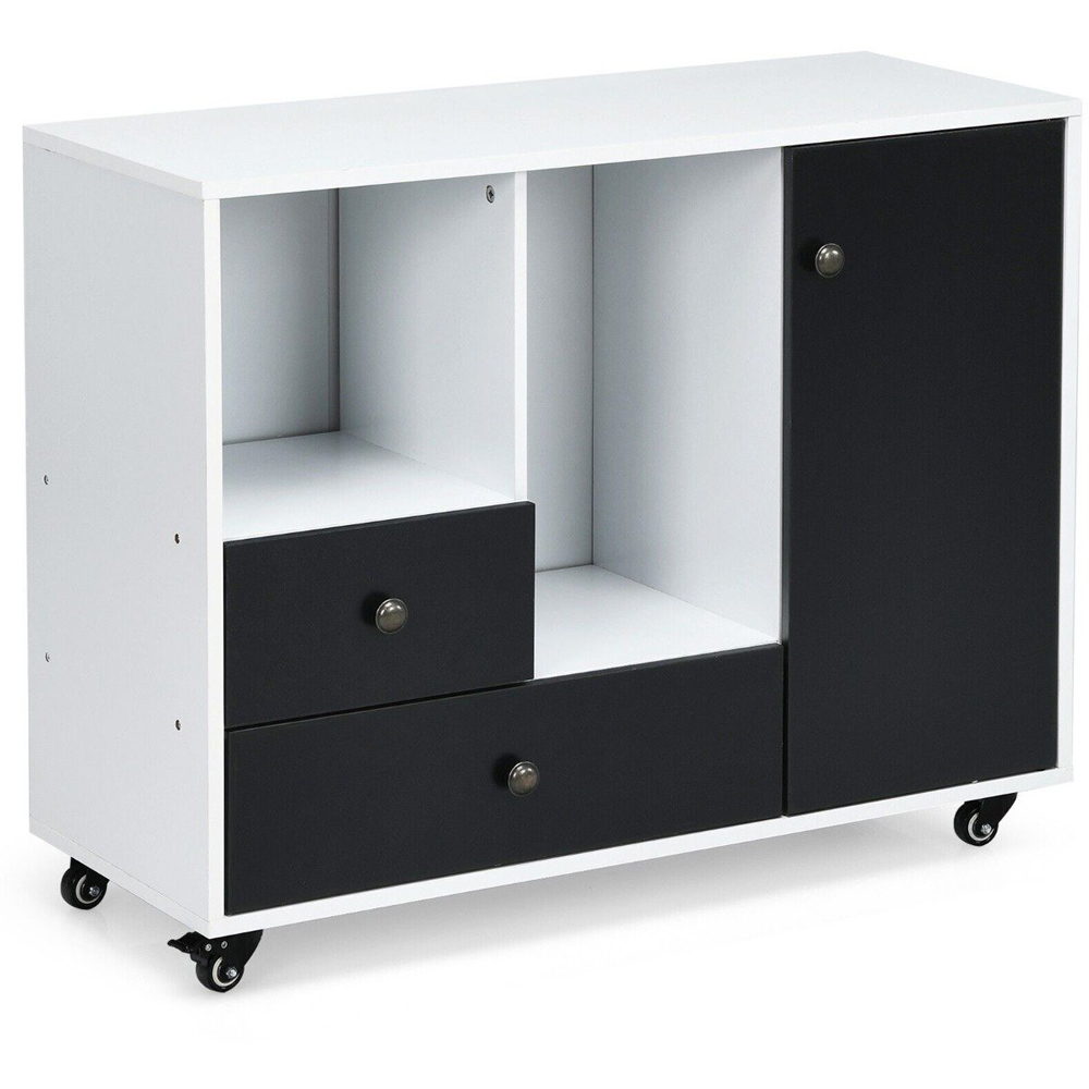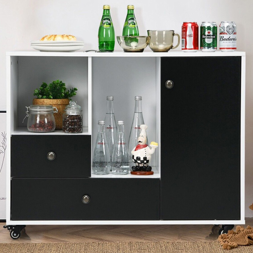 Enhance your workspace or home with the versatile Lateral Stationery Storage Cabinet Chest, which not only adds a touch of modern appeal but also offers a practical solution with its multi-storage capabilities. This robust unit features two drawers, two open shelves, and two concealed adjustable cubbies, topped with a spacious cabinet surface for additional display or storage. It's mounted on four steel casters, making relocation a breeze while ensuring stability with an effective braking system. Whether used as an office filing organizer, a kitchen rolling buffet, or a storage sideboard, this cabinet's classic contemporary style seamlessly integrates into any setting. The adjustable inner shelf with three positions allows for customization according to personal needs, making it an ideal choice for keeping any area tidy and organized.