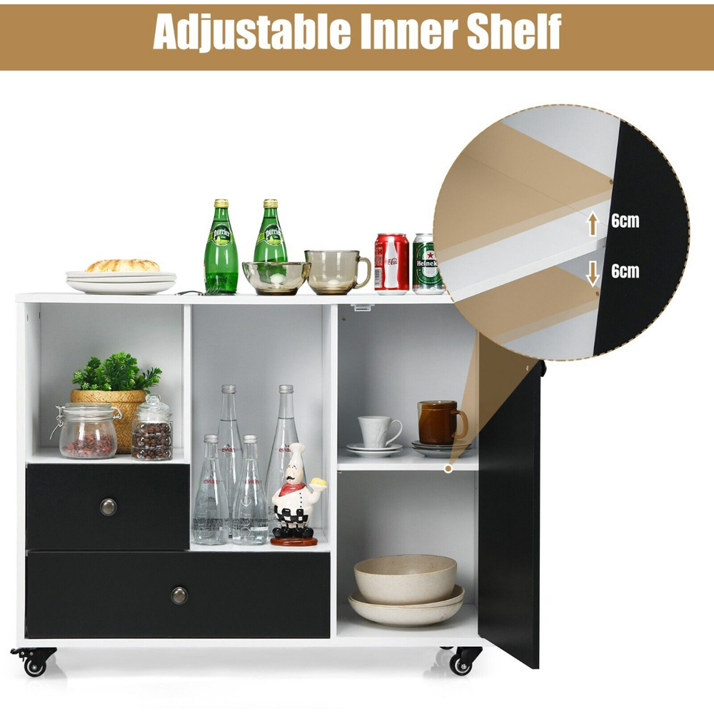 - Features 2 drawers, 2 open compartments, and adjustable shelves