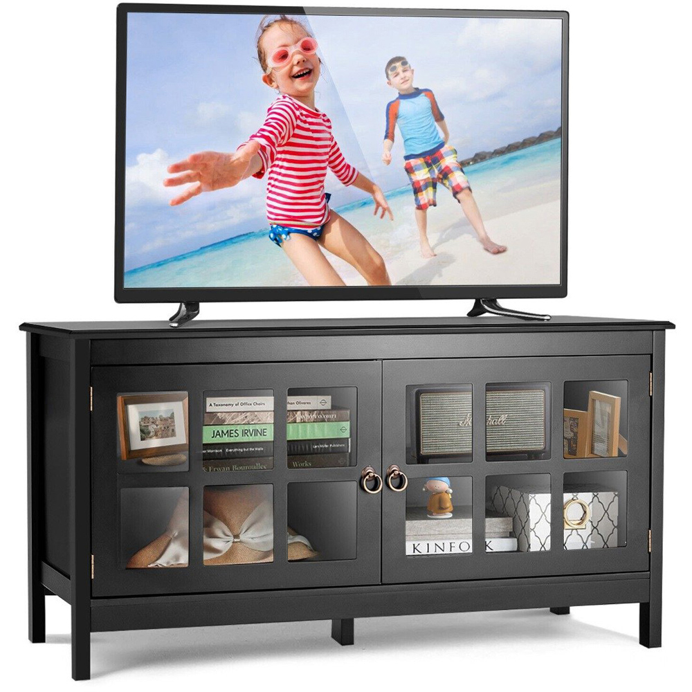 Enhance your entertainment centre in an organized way with this Costway 2 Glass Door Black Wooden TV Unit. This modern TV console table combines style, function and comfort to meet your needs. Crafted from durable particle board and MDF board, this TV console ensures long years to use and is easy to clean. With a 45 x 19 inch top, the table is large and wide enough to accommodate TVs up to 50 inches. This storage cabinet with three adjustable shelves provides ample storage space for your daily essentials behind double doors with tempered safety glass panes. And its cable management system helps you maintain a tidy entertaining space to enjoy your favourite movies and games. Supported by five raised legs for enhanced stability, the media entertainment centre stands firmly on the ground without wobbling. This modern console table fits any home decor with function and aesthetics, and can be widely used as a hallway table, entertainment centre, media stand, storage console table, etc. Designed in a simple compact outlook, this modern contemporary media stand fits well in various decoration styles to match the rest of your furniture.