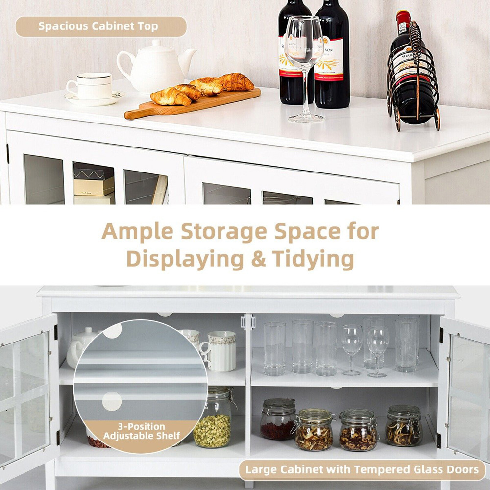 Enhance your entertainment centre in an organized way with this Costway 2 Glass Door White Wooden TV Unit. This modern TV console table combines style, function and comfort to meet your needs. Crafted from durable particle board and MDF board, this TV console ensures long years to use and is easy to clean. With a 45 x 19 inch top, the table is large and wide enough to accommodate TVs up to 50 inches. This storage cabinet with three adjustable shelves provides ample storage space for your daily essentials behind double doors with tempered safety glass panes. And its cable management system helps you maintain a tidy entertaining space to enjoy your favourite movies and games. Supported by five raised legs for enhanced stability, the media entertainment centre stands firmly on the ground without wobbling. This modern console table fits any home decor with function and aesthetics, and can be widely used as a hallway table, entertainment centre, media stand, storage console table, etc. Designed in a simple compact outlook, this modern contemporary media stand fits well in various decoration styles to match the rest of your furniture.
