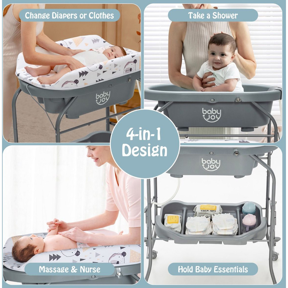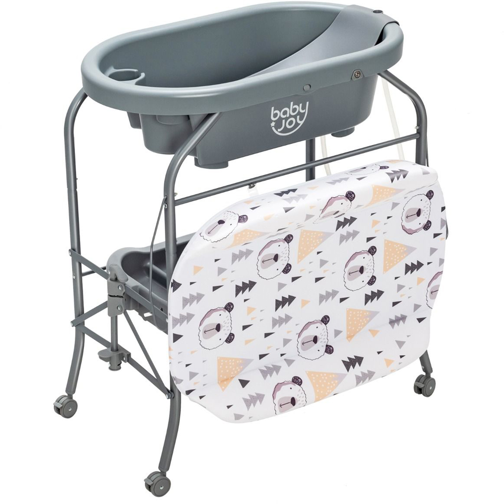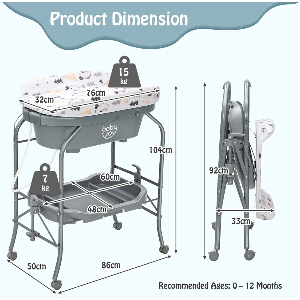 Add functionality and comfort with the Costway 2 in 1 Baby Changing Station with Bathtub. With a practical bathtub, this baby changing station is designed for versatility. It is suitable whether you use it to change diapers for your baby or bathe your baby. And the storage slots as well as the storage basket will hold baby's essentials for easy access. In addition, the reasonable height can effectively relieve your back pains from bending too much. The drainage system makes water drainage an easier thing. The selected materials have passed ASTM and CPSIA certifications ensure reliability and security. When you do not need to use it, you can fold the diaper changing station and store it in the corner to save space. The changing pad (weight capacity: 11 kg) is water resistant for easy cleaning. Also, the changing pad can be flipped over and fixed with the buttons, which is space-saving when not in use. This bathtub, measuring: 58 x 32 x 20cm, has a curved tray for your baby and 2 practical storage slots for bathing essentials, holding up to 15 kg. Made of high quality PP material, this diaper changing station is built to last. The baby changing table is firmly supported by sturdy metal frame for a steady performance when in service. The diaper changing station is equipped with 4 universal wheels that will help move it from one place to another easily. And, all the wheels can be locked for extra stability and safety.