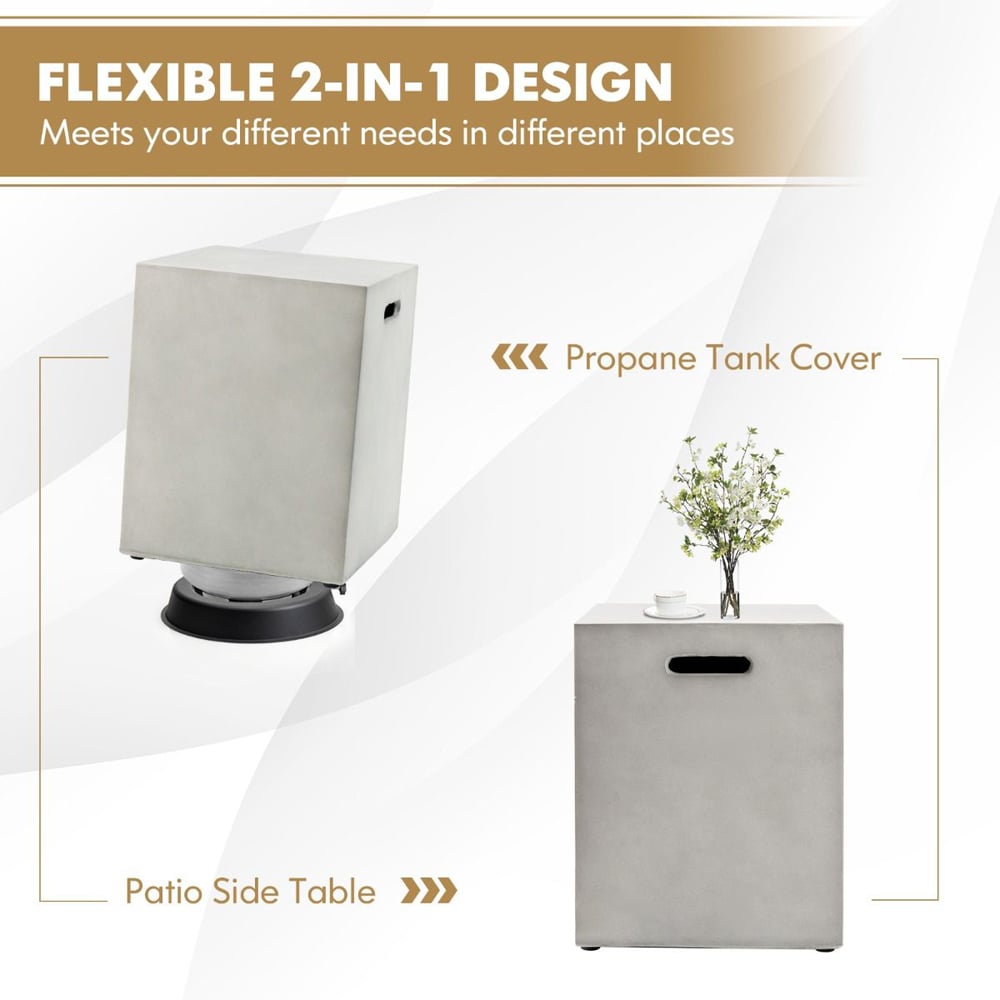 Elevate your outdoor space with the versatile Costway 2 in 1 Grey Propane Gas Tank Cover Side Table, ingeniously designed to serve dual functions. This multifunctional piece is not only an efficient propane tank cover but also doubles as a chic outdoor side table. Crafted from natural mineral powder and powder-coated steel, it promises durability and stability, ensuring it withstands various weather conditions. Perfect for gardens, patios, and courtyards, it seamlessly blends functionality with style. The built-in handles facilitate easy movement, while the simple assembly and easy-to-clean surface make it a practical choice for any outdoor setting.