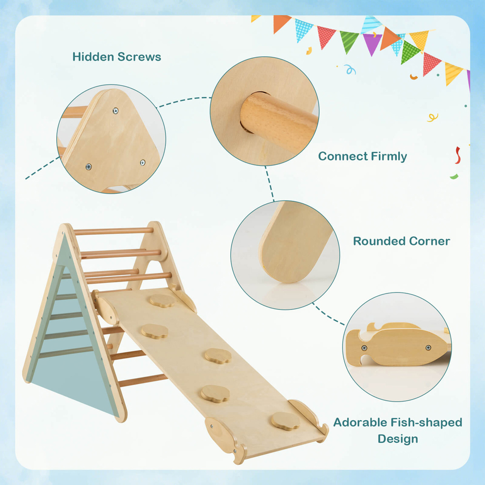 Create your child's playground at home with the Costway 2-in-1 Natural Wooden Triangle Climbing Ladder Set with Reversible Ramp. This triangle climbing ladder is specially designed with recessed screws, a burr-free surface and polished corners. The BAP-free beech wood and birch wood material make it a safe and harmless playground for your children. It includes grooves that firmly attach the climbing and sliding to the bar. You can easily move the reversible ramp and place it in a higher, middle or lower place, providing different difficulty levels. This climbing ladder set boosts your child's self-confidence, creativity and body strength while climbing or sliding. It is an ideal addition to the home play area to strengthen children's motor skills and balance control. The set is crafted from 100% premium natural wood for great durability. It is non-toxic and odourless, more environmentally friendly, safe and durable than plastic materials, creating a safe environment for your kids when playing. It is best suited for children over three years and can be assembled with the help of a step-by-step instruction guide. This ladder set with the two-side ramp is perfect for home, kindergarten or daycare. The edges are designed with rounded corners for safe playtime. This triangle climbing ladder set is the ideal gift to indulge your child in the world for fun learning!