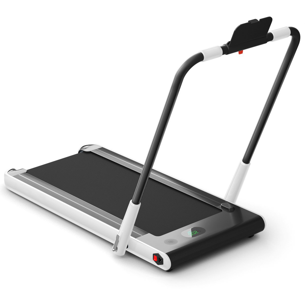 Elevate your fitness routine with the Costway 2 in 1 White Foldable Treadmill with Bluetooth Speaker. It is designed to cater to both your running and walking needs. Whether you're at the office, gym, or home, this treadmill is a perfect choice, featuring a five-layer non-slip running belt that absorbs shocks and protects your knees, leg muscles, and joints. Its versatile design allows you to adjust the speed up to 12km/h when unfolded and up to 4km/h when folded, accommodating different fitness levels. The front LED display keeps track of speed, time, distance, and calories, ensuring you're always on top of your workout metrics. With the convenience of a built-in Bluetooth speaker, you can stay entertained by listening to your favourite music or watching videos on your phone placed on the treadmill's stand. The folding mechanism and wheels make it easy to move and store, saving space in your home or office.