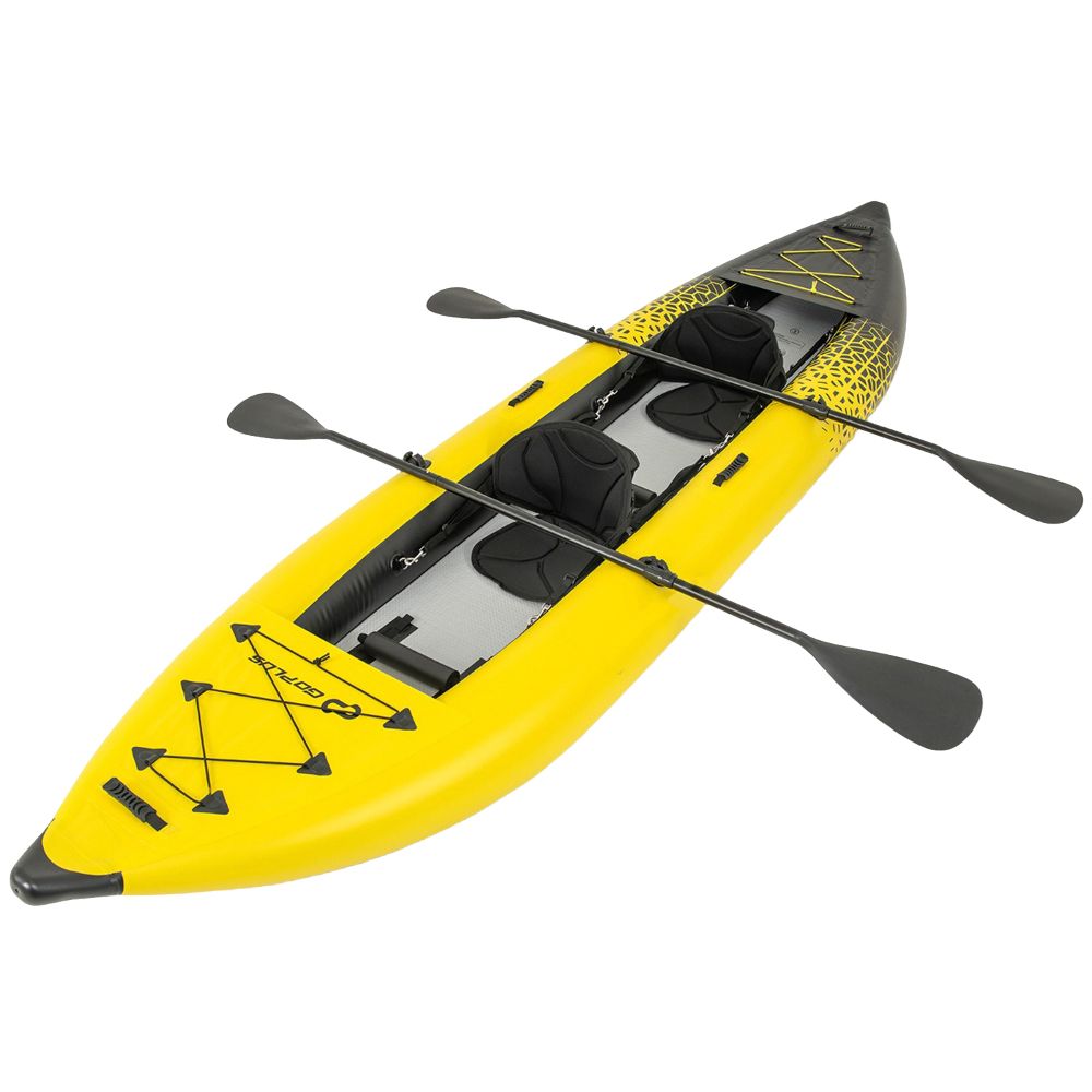 Coming with two lightweight aluminium oars and two directional fins, the kayak features flexible manoeuvrability and excellent stability. Thoughtfully, there are buckles to help fix the oar when you needed. This kayak features two padded EVA seat and footrest, which are adjustable to let you find the ideal position. And this two-seater kayak offers more fun for you then rowing alone. If you want to carry some food or tools, there are bungee straps for additional accessories. Besides, the three-chamber construction and bottom drainage hole will prevent leakage for safe rowing. Additionally, there are repair kit to prevent some accidents. Besides, the kayak is made of high-grade material, which is wear-resistant and high strength for longer companionship. More importantly, the kayak is quick and simple to inflate. Meanwhile, the inflatable design allows you to easily deflate and store it for storage. With the included carry bag, you can conveniently carry it to everywhere. Hence, it is an ideal choice for two delightful journeys on water.
