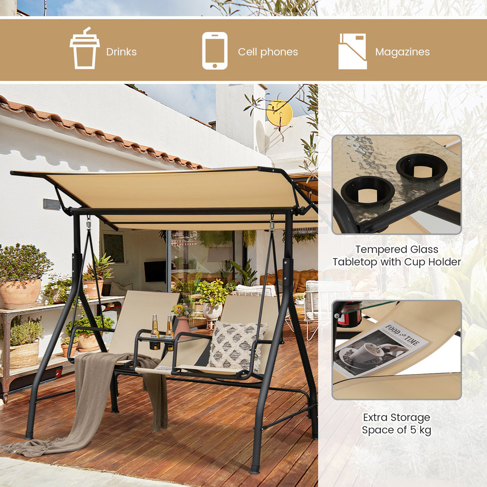 Indulge in serene moments and gentle breezes with the Costway 2 Seater Beige Adjustable Canopy Patio Swing, perfect for any garden, porch, or backyard setting. This swing chair is crafted from high-quality, breathable fabric that is both wear-resistant and fast-drying, ensuring durability and comfort. Its robust steel frame and heavy-duty spring hook guarantee stability, supporting up to 240 kg, while the non-slip feet enhance its steadiness further. The cleverly designed adjustable canopy can be tilted from 0° to 180°, providing optimal shade throughout the day. Additionally, the built-in tempered glass table, complete with two drink holders and an extra storage shelf, offers convenient space for your essentials, making this swing not just a seat but a cosy retreat for two.