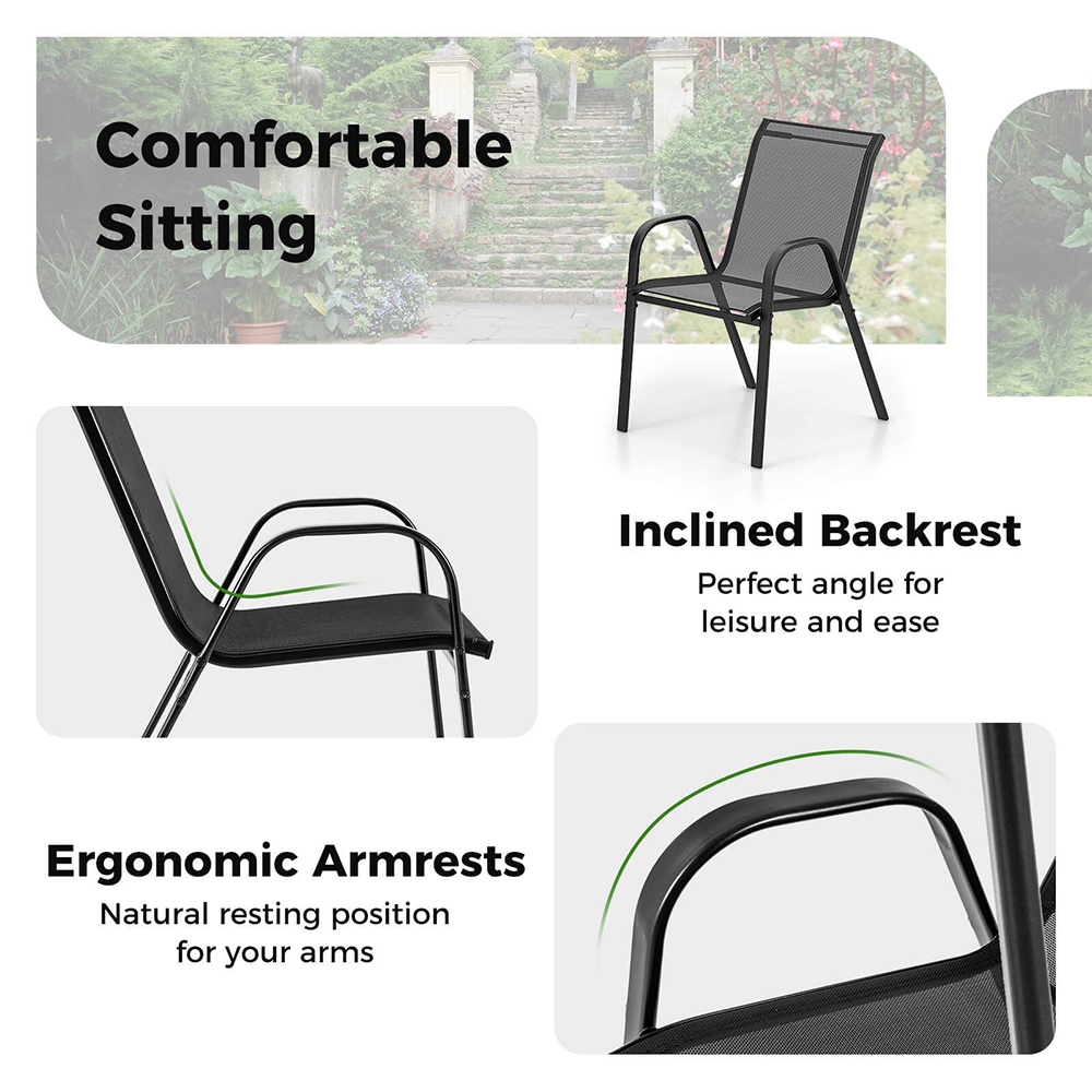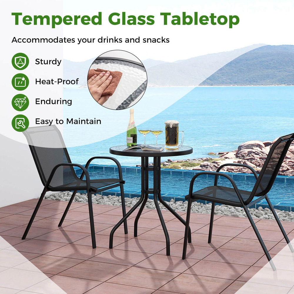 Experience the ultimate in outdoor dining with the Costway 2 Seater Black Garden Bistro Set. Featuring ergonomic backrests and supportive armrests, these patio chairs allow you to experience ideal comfort. Given the tear-proof and wear-proof fabric, the set dries very quickly. Therefore, you can use it in your gardens, balconies, or poolside areas. The tabletop is fitted with a sleek tempered glass top, making it sturdier. The table is easy to maintain because of the heat-proof surface. The metal structure of the table and chairs offer sturdy foundations and make them long-lasting. Given this sturdy construction, the table has the capacity to support up to 50kg of weight and each chair can hold up to 150 kg of weight. These table and chairs are equipped with anti-slip foot pads for additional strength. Plus, this serves as a practical and space-efficient solution without compromising style or comfort where space is an issue. Designed for multi-scene use, this patio bistro set seamlessly blends with multiple outdoor settings. Assembling this set is easy as it comes with clear instructions.