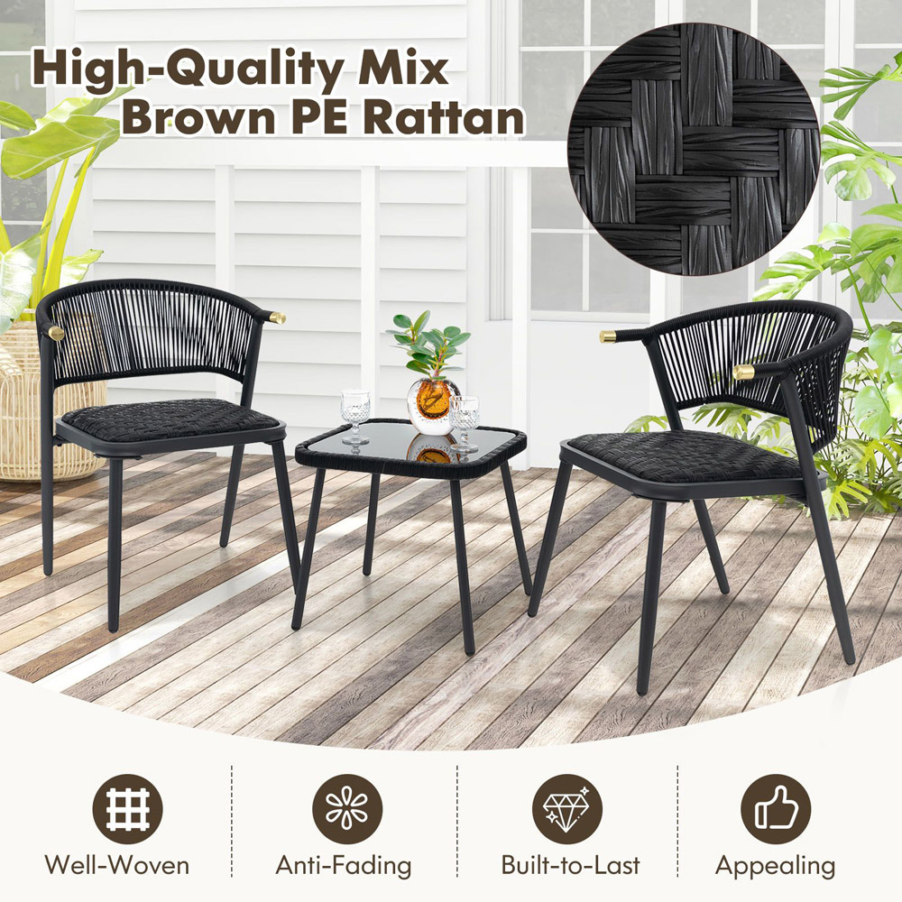 Create a tranquil outdoor retreat with the Costway 2 Seater Black PE Rattan Bistro Set. This patio set features two chairs with quick-dry foam padded seats and a coffee table with a sturdy tempered glass top. The chairs, made with high-quality PE rattan and supported by a strong metal structure, can support up to 180 kg each, ensuring durability and style. The elegant coffee table, securely held by suction cups, provides convenience and adds sophistication to the set. This set promises both durability and comfort, making it a superb addition to any outdoor decor.