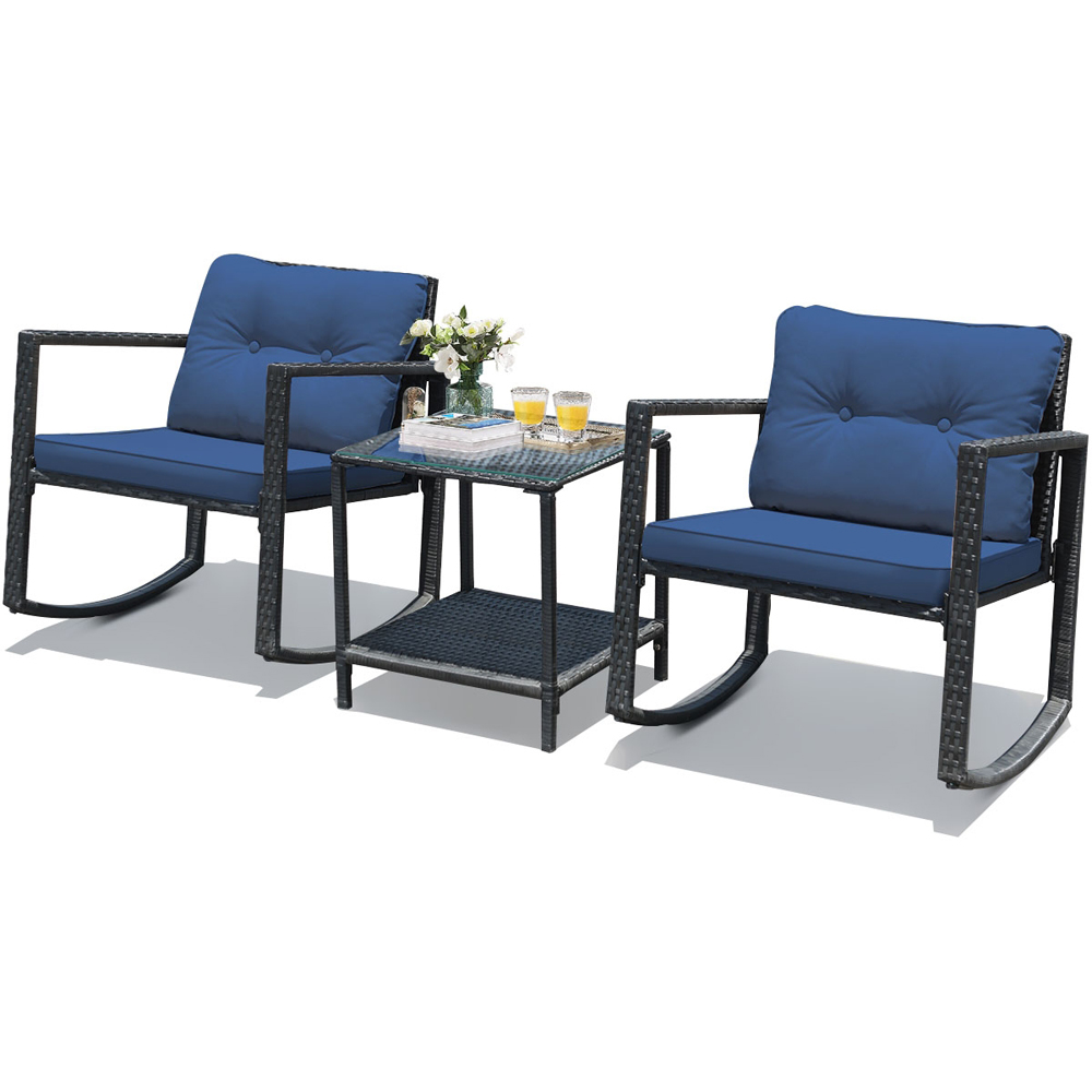 Revamp your outdoor dining area with the Costway 2 Seater Garden Rocking Bistro Set. Made of heavy-duty steel, this set offers a strong bearing capacity and cannot be deformed easily. This set is adorned with weather-resistant black PE rattan, offering durability and longevity. This set includes a side table where you can spend peaceful coffee time with your friends or family in the backyard, poolside, deck, etc. This table includes a bottom shelf, offering you sufficient space to store and access your coffee equipment, books or other items. These wicker rattan chairs smoothly sway like a cradle when you sit on them. Plus, the ergonomic armrests and soft cushions are padded with a high-density sponge to offer additional comfort. Please always keep cushions dry to prolong the service time. Given the light avoidance and light exposure, the colour of the cushions is somewhat different. The coffee table is enveloped with tempered glass with suction cups. Therefore, you can easily wipe out the stains or remove the glass to clean if required. Additionally, the cushion covers are fitted with zippered to make it washable and replaceable. Starring a modern design, this patio conversation set fits well with different decoration styles, adding grace to any decor.