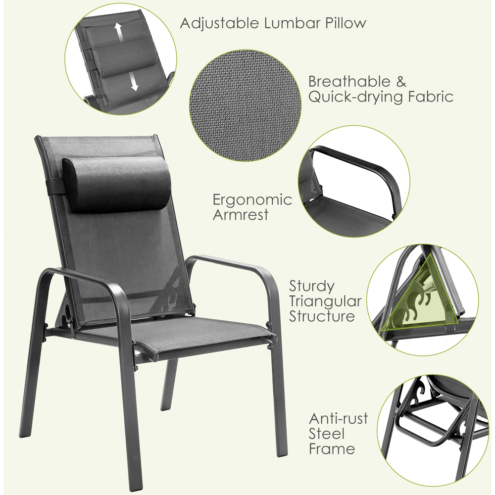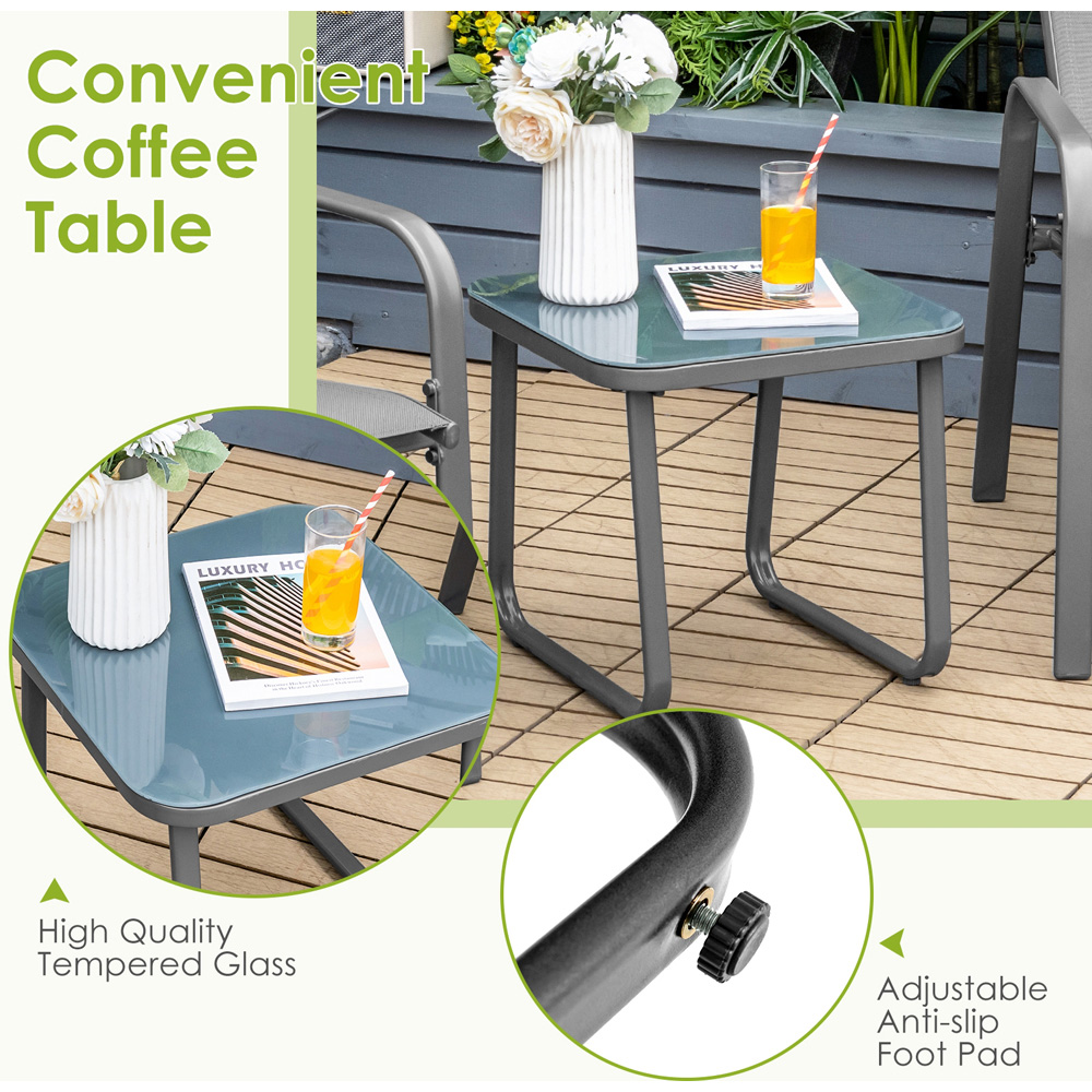 Make your outdoor space stand out with the Costway 2-seater Patio Bistro Set in Grey. This stylish set is perfect for small areas like patios, porches, and balconies. The chairs have adjustable backrests and headrests for personalized comfort, and the glass coffee table has anti-slip foot pads to keep your items secure. The bistro set is made of sturdy, rust-resistant steel and quick-drying fabric, making it durable and stable outdoors. After use, you can stack the chairs to save space (just remember to fold the backrest first). Each stackable chair is 89cm long, and the backrest has three adjustable positions. The chairs also have an adjustable lumbar/head pillow, soft sponge padding, and ergonomic armrests for added relaxation. The dimensions of each unfolded chair are H97/81/60cm x W57 x L71/90/103cm, and the table is H41 x W44 x L44cm. Each chair can hold up to 150kg, and the table can hold up to 50kg. Review the size description before purchasing, as there may be slight dimensional discrepancies due to manual measurement. When assembling, remember not to tighten all the screws until all the holes are aligned.