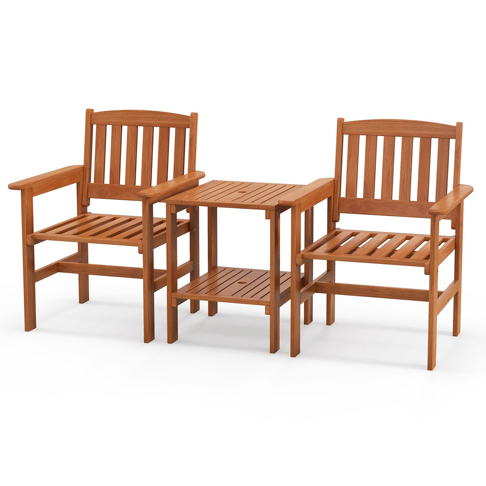 Elevate your outdoor lounging experience with the Costway 2 Seater Patio Bistro Table and Chair Set. It is designed to blend durability with comfort and style. Crafted from natural wood, this set includes a double-layer coffee table and two chairs, making it perfect for any patio, deck, balcony, or garden setting. The coffee table features a convenient umbrella hole for adding shade on sunny days, ensuring a comfortable dining experience, while the ergonomically designed chairs with widened armrests offer enhanced comfort. With its waterproof and splinter-free surface, maintenance is effortlessly simple, allowing you more time to relax and enjoy your outdoor space.
