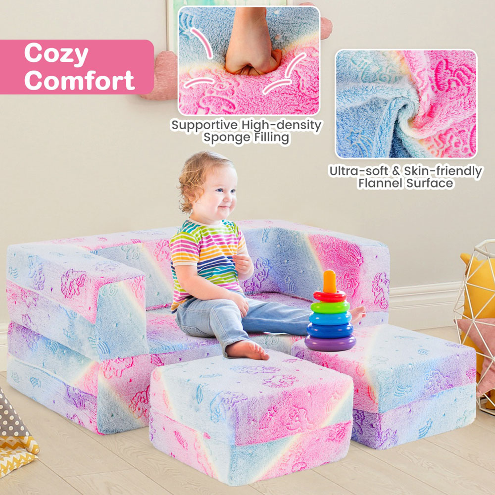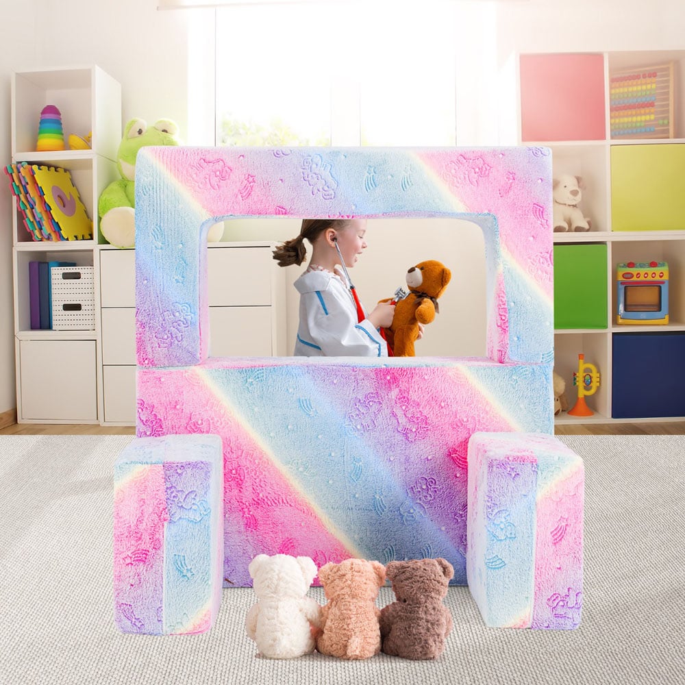 This Costway 2 Seater Pink Kids Glow in the Dark Sofa Set is a launchpad for imagination and adventure. Designed with kids who are afraid of dark in mind, the cute patterns of sofa light up in the dark, turning fears into fairy tales. Crafted with love for comfort and safety, these fluffy flannel sofa blocks are filled with supportive foam, making them the perfect snuggle spot for your little ones. They're also the ideal base camp for all sorts of active play, fuelling their creativity and energy. Cleaning is a breeze with the removable, machine-washable cover, saving you time for important parent-child interactions. Gift your kids with joy and watch the smiles grow with this kids' play couch! If you are looking for such a product, do not hesitate to buy it! This kids' play couch transforms effortlessly into a table, a sleeper bed, a puppet theatre, or a ball pit for endless fun. Its lightweight design lets kids craft their own space, sparking imagination and creating cherished memories. The soft flannel surface of this kids' sofa features luminous patterns. Just expose it to daylight for at least ten minutes. Kids can then watch cute dinosaurs or unicorns light up the dark, turning bedtime into a fearless, dreamy adventure. Filled with resilient high-density foam, this toddler couch supports all sorts of active play for enhancing kids' coordination and motor skills. Plus, the hidden zippers and rounded edges keep your little explorers protected from accidents. The fluffy cover of our comfy fold-up couch is easy to detach and clean by washing machines. Upon washing, the fabric will neither shrink, fade, nor lose its appealing glow. Please wash with cold water and tumble dry on low. Ideal for birthdays or Christmas, this two seater baby couch delights boys and girls over three years old. Set it up in playrooms, kids' bedroom or in your living room, and transform it into a fun centre for your little ones. No assembly needed. Upon unboxing, please remove the wrapping with care, and wait for 1 to 2 days for sponge to fully restore its shape. You can also use a hairdryer to speed up the shape-regaining process, or to smooth out the wrinkles.