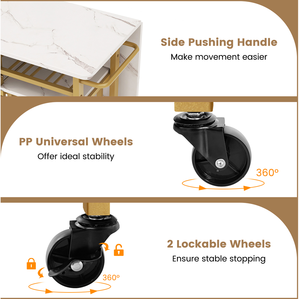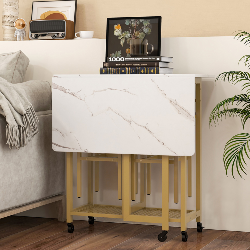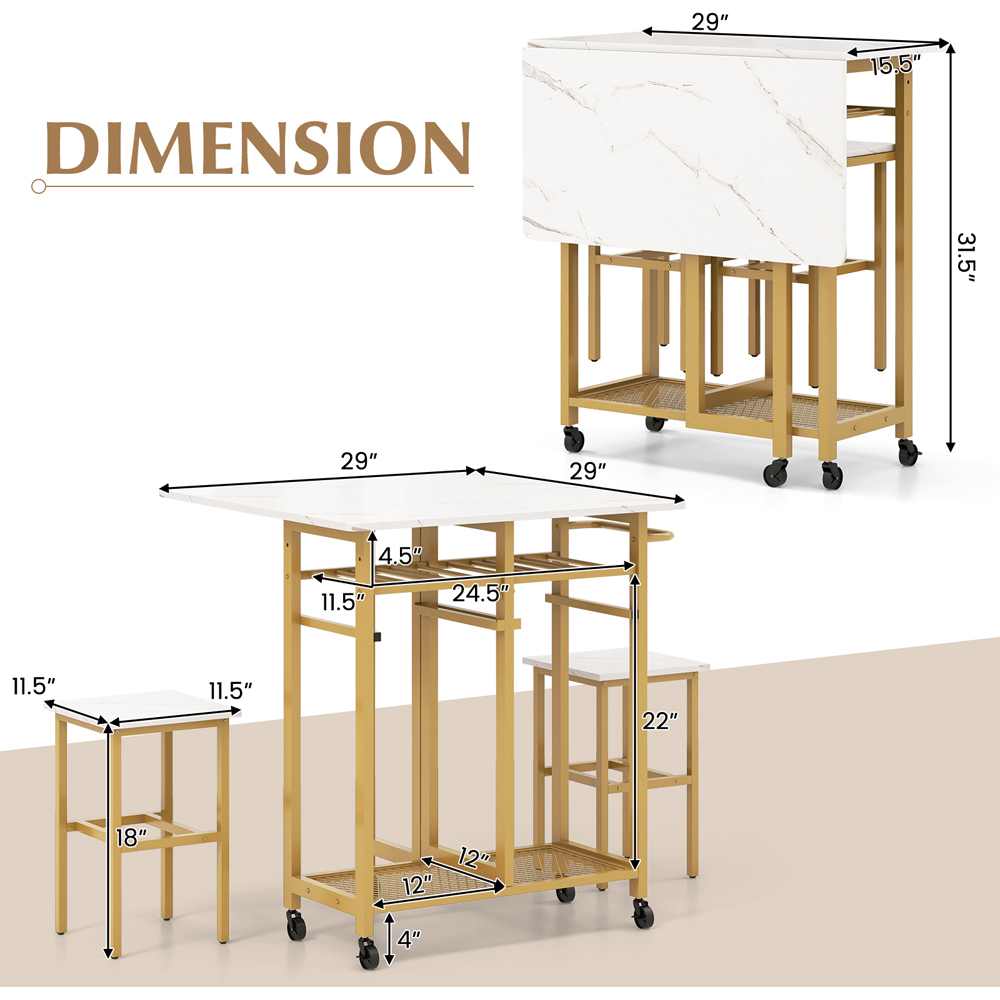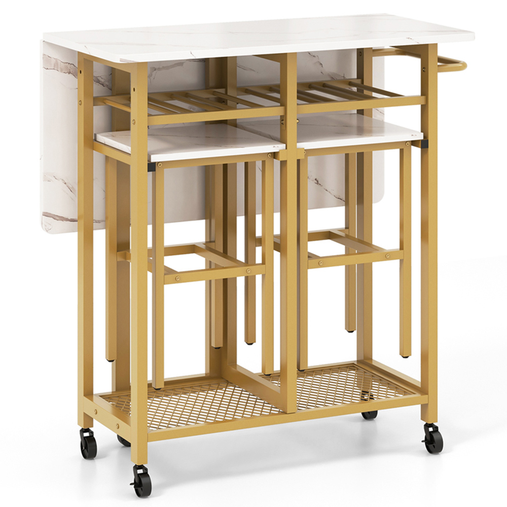 Make an elegant and functional addition to your kitchen space with the Costway 2 Seater Extending Dining Table Set White. This dining table can be extended or folded in half, making it an ideal choice for small apartments or studios. It includes two square stools that provide cosy seating and can be neatly hung below the tabletop using anti-falling stoppers, optimising floor space. It features a six-bottle wine rack, allowing for elegant display and easy access to your favourite bottles. Additional bottom shelves provide a perfect place to organise all your dining essentials. Crafted with powder-coated metal, this dining set exemplifies exceptional strength and rust resistance. The table supports up to 120kg and each stool holds up to 150kg weight. It also features effortless mobility with four universal wheels, including two lockable ones, while a convenient pushing handle adds practicality during furniture rearrangement. The dining table features a flexible tabletop that can easily adjust to provide a larger dining surface of 74 x 74cm and accommodate extra guests.