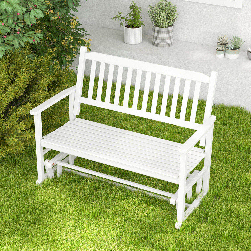 Enjoy some outdoor leisure time for two with the Costway 2 Seater White Glider Garden Bench. This bench is made of solid poplar wood with PU painting, making it robust and capable of supporting up to 227kg. The 118 x 49cm seating area is perfect for intimate conversations or simply enjoying some quiet moments with a loved one. Its bearing arm brackets offer a smooth and noiseless gliding motion, turning this outdoor swing glider into an ideal spot to relax. This patio swing glider bench boasts a 105° ergonomic angle and curved seating for added comfort without compromising on aesthetics. Its slatted design also ensures breathability. Measuring H100 x W68 x L126cm in dimension, this outdoor patio swing glider creates a cosy and stylish spot in your backyard, garden, deck, or any other outdoor space.