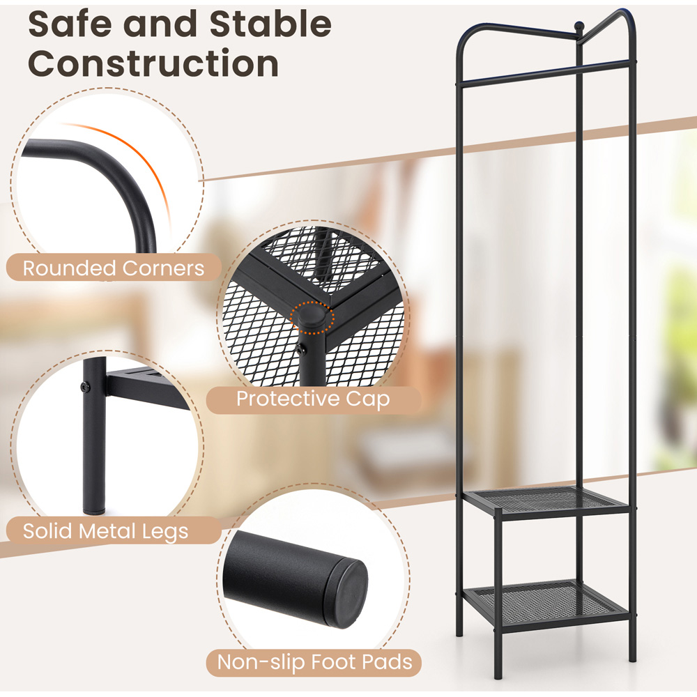 Maximize your space with style and functionality using the Costway 2 Shelf Black Corner Coat Rack. Designed to fit perfectly into any corner, this coat rack is an ideal solution for tidying up your entryways, hallways, or bedrooms without occupying too much floor space. It features a top hanger for coats, scarves, and umbrellas, along with two mesh shelves that are perfect for storing shoes, baskets, and more. The solid metal construction ensures stability, while the non-slip foot pads and anti-toppling design provide extra safety and durability. Rounded corners and a protective cap help prevent scratches, making this coat rack not only practical but also safe for homes with active kids and pets.