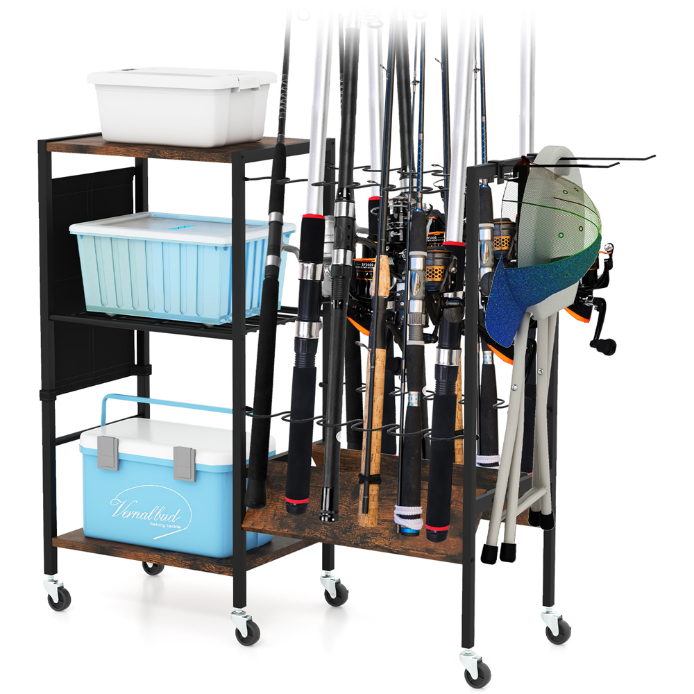 This fishing gear tackle cart accommodates various types of fishing rods and combos, capable of holding up to 12 rods. The two ripple brackets securely hold rods in place, ensuring your fishing rods are safe from swaying. Moreover, you can maximize storage capacity with this fishing gear organiser with shelves, storage bag and hooks. The movement is easy with the help of universal wheels, including 3 lockable wheels. This fishing rod rack on wheels makes for a anyone looking for a convenient and efficient way to store their fishing equipment. Fit Most Fishing Rods or Combos: This fishing rod holder is suitable for various types of fishing rods and combos. With a special design, this fishing rod holder can hold up to 12 fishing rods with diameters less than 40mm. Protect your Fishing Rods: The MDF board at the bottom prevent fishing rods from sliding down. More, the inward ripple bracket on the top and outward ripple bracket on the bottom securely hold your fishing rods, avoiding swaying right and left. Large Storage Capacity: This fishing gear organiser is equipped with a two-tier waterproof shelf, a rustproof metal mesh, an Oxford fabric storage bag and two high-end hooks for all your fishing equipment, such as your fish box, bait box, fishing chair, fish net, etc. Rolling with Ease: Coming with six universal wheels (including three lockable wheels), this fishing gear tackle cart allows for mute rolling on various surfaces, making storage and movement between rooms easier. A Perfect Fishing Gift: This fishing rod rack on wheels is a versatile option for fishing equipment storage. It will be a delight gift for anyone.