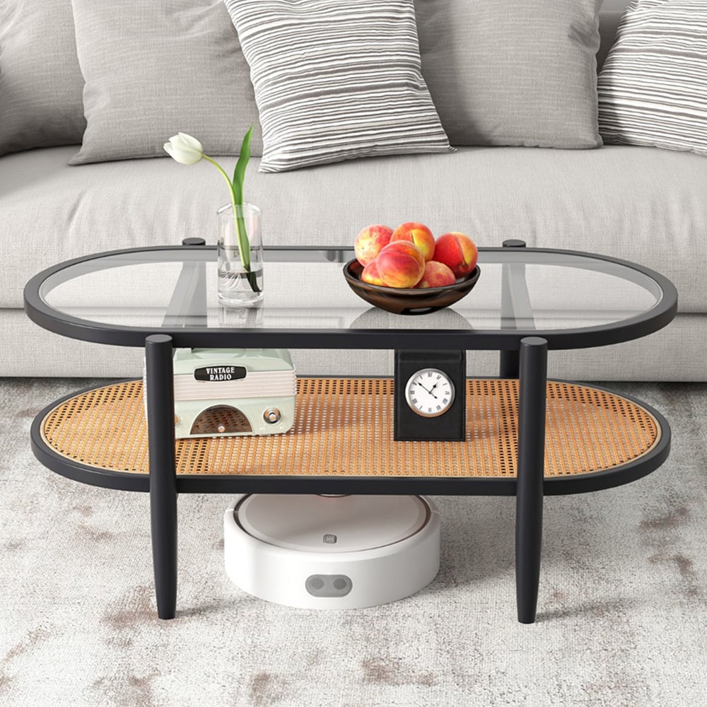Keep your space tidy and stylish with the 2-Tier PE Rattan Coffee Table with Storage in a sleek black finish. Designed for both functionality and aesthetic appeal, this coffee table features a heatproof tempered glass top for easy cleaning and a tear-proof PE rattan shelf that resists fading, ensuring it remains a centrepiece in your living room, reception area, or office for years. The sturdy acacia wood structure supports up to 55kg and includes anti-slip foot pads to protect your floors, while the divided storage space helps you organize essentials like magazines, snacks, and decorative items effortlessly. Enjoy the convenience of hassle-free assembly and transform your area into a chic and practical setting.- Holds up to 55kg with sturdy acacia wood construction.