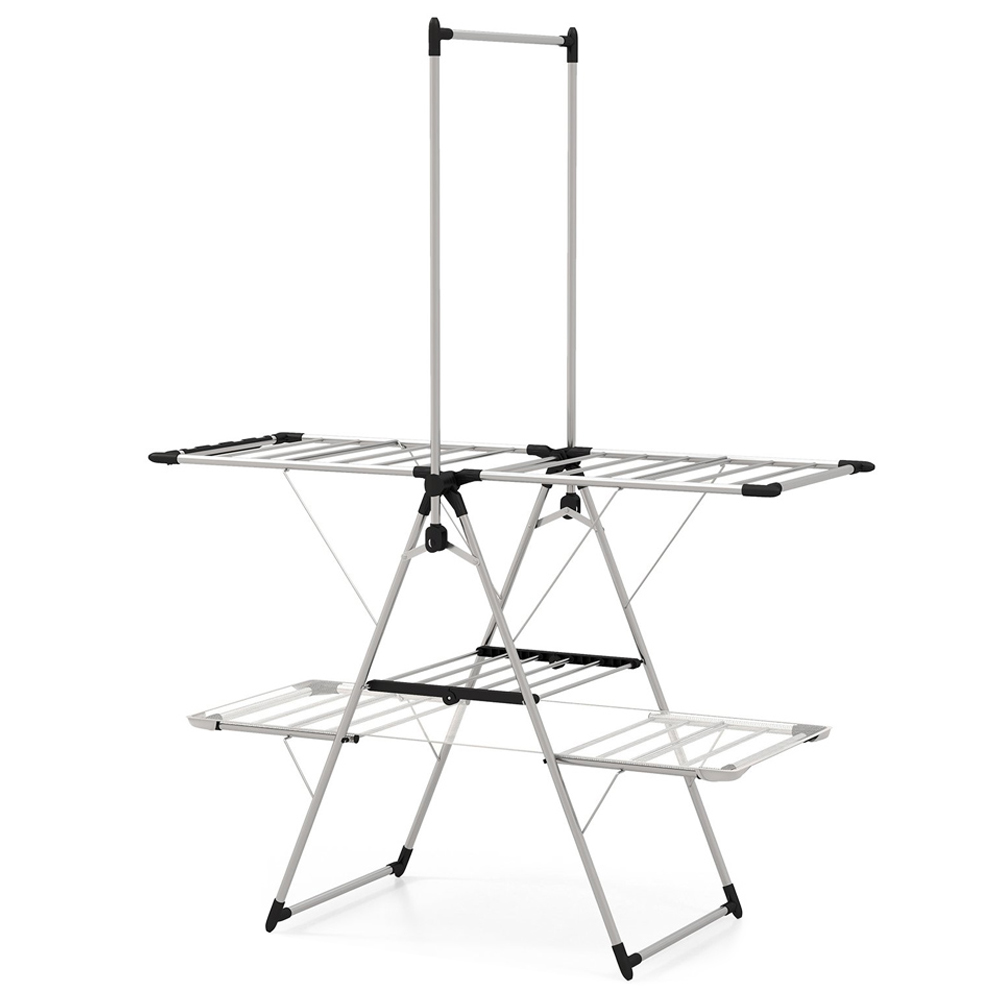 Elevate your laundry routine with the 2-Tier Foldable Laundry Drying Rack with Tall Hanging Bar, designed to meet all your drying needs efficiently. This versatile rack boasts adjustable height wings, allowing you to hang everything from long flowing dresses to compact jackets with ease. Its foldable design ensures it fits snugly in the smallest of spaces, making it ideal for homes with limited storage. The inclusion of a top hanging rod, side rack with mesh, sock clips, and a shoe hook provides ample space for various items, ensuring your space stays tidy and well-organized. Crafted from premium stainless steel, this durable rack is both water and rust-resistant, ensuring longevity and ease of use right out of the box with no assembly required.