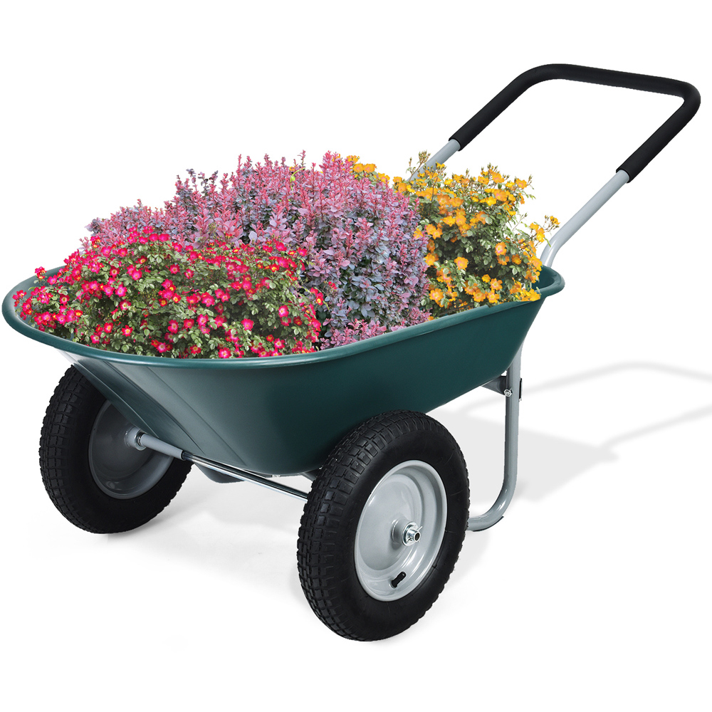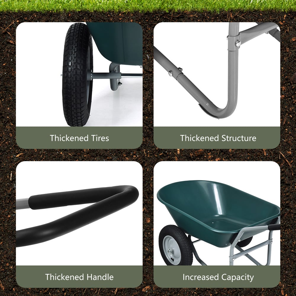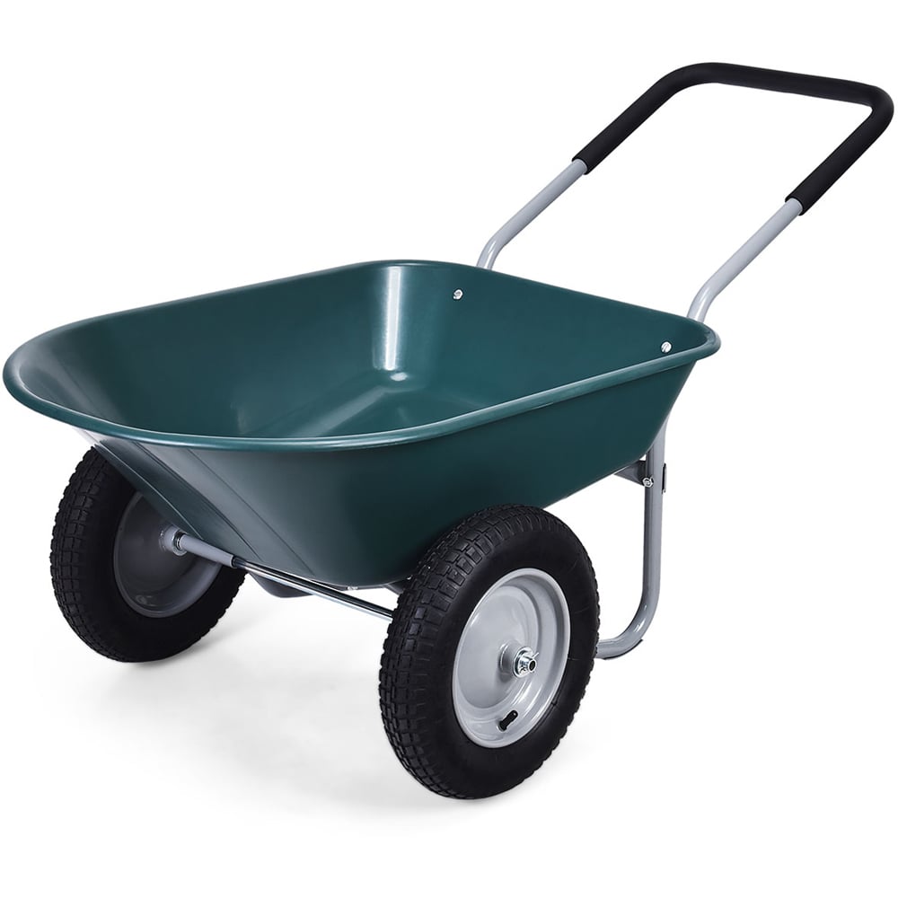 Upgrade your outdoor toolkit with the Costway 2 Tier Green Wheelbarrow. Featuring a glossy finish and mobile design, this wheelbarrow provides you with a favourable garden assistant to transport heavy goods without putting much pressure on your hands. This garden cart is suitable for many grounds including patio, warehouse and farm. Constructed of a stable heavy-duty frame and PP container, this garden wheelbarrow offers you a rigid yet lightweight cart to transport your fertilisers and weeding in your garden. Plus, the rubber pneumatic tyres on both sides make it easier to lift, balance and manoeuvre. Containing the deep volume with an easy-to-dump design, this yard cart provides 80L of space for the 150kg hauling capacity. Moreover, the large, pressed area can be uniformly forced, ensuring that the container will not deform and break with time. It also contains a padded loop handle that not only gives convenience to controlling the direction and keeping balanced but also makes it easy to load and dump the cargo. It comprises two 33cm pneumatic tyres with patterns that add much more friction with the ground, making it suitable for various terrains. With detailed and simple installation procedures, this heavy-duty wheelbarrow can be assembled effortlessly. Plus, the steel frame with painting is easy to clean up and hassle-free.