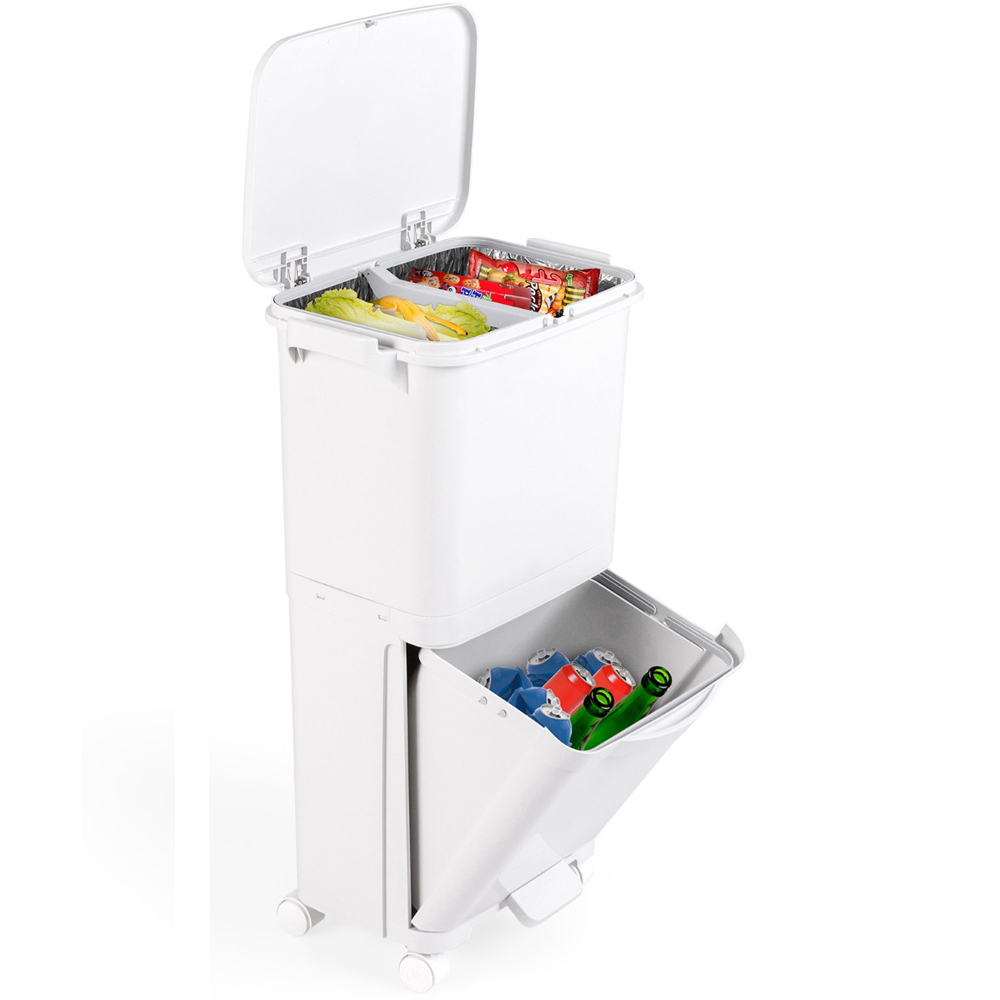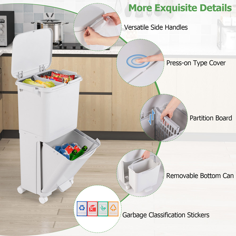 Effortlessly manage your waste with the innovative 2-Tier Trash Can, featuring a tilt-designed bottom bin and lockable wheels for ultimate convenience. This versatile trash can is equipped with three compartments, allowing for efficient sorting of residual waste, household food waste, and recyclables. The raised height design ensures easy disposal without the need to bend, while the robust PP construction provides durability. With a generous 40L capacity, it's ideal for compact spaces in the living room, kitchen, or dining room. Additional features include a press-on type cover, garbage classification stickers, and a removable bin for straightforward cleaning, making it a practical and essential household item.