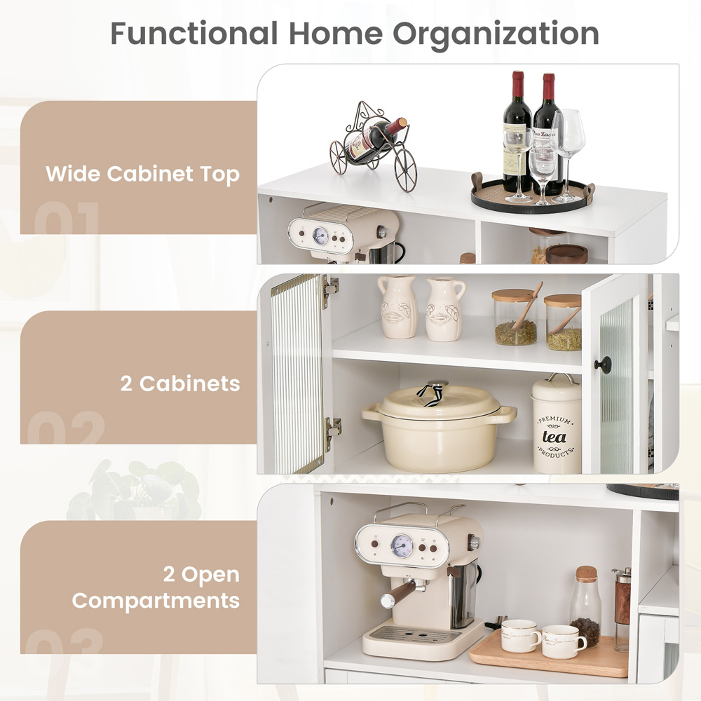 Bring a touch of industrial elegance to your home with this wooden kitchen storage cabinet, complete with tempered glass doors in a chic white finish. This robust piece is crafted from high-strength MDF and sprayed steel, ensuring not only great load capacity but also durability. With its anti-toppling design and non-slip foot pads, the cabinet guarantees stability and floor protection. It offers abundant storage solutions with its wide countertop, open compartments, and two closed cabinets featuring 3-position adjustable shelves. The tempered glass doors, equipped with magnetic catches and zinc alloy handles, add a stylish yet functional touch to this versatile sideboard, making it perfect for various rooms including the kitchen, dining room, and living room.
