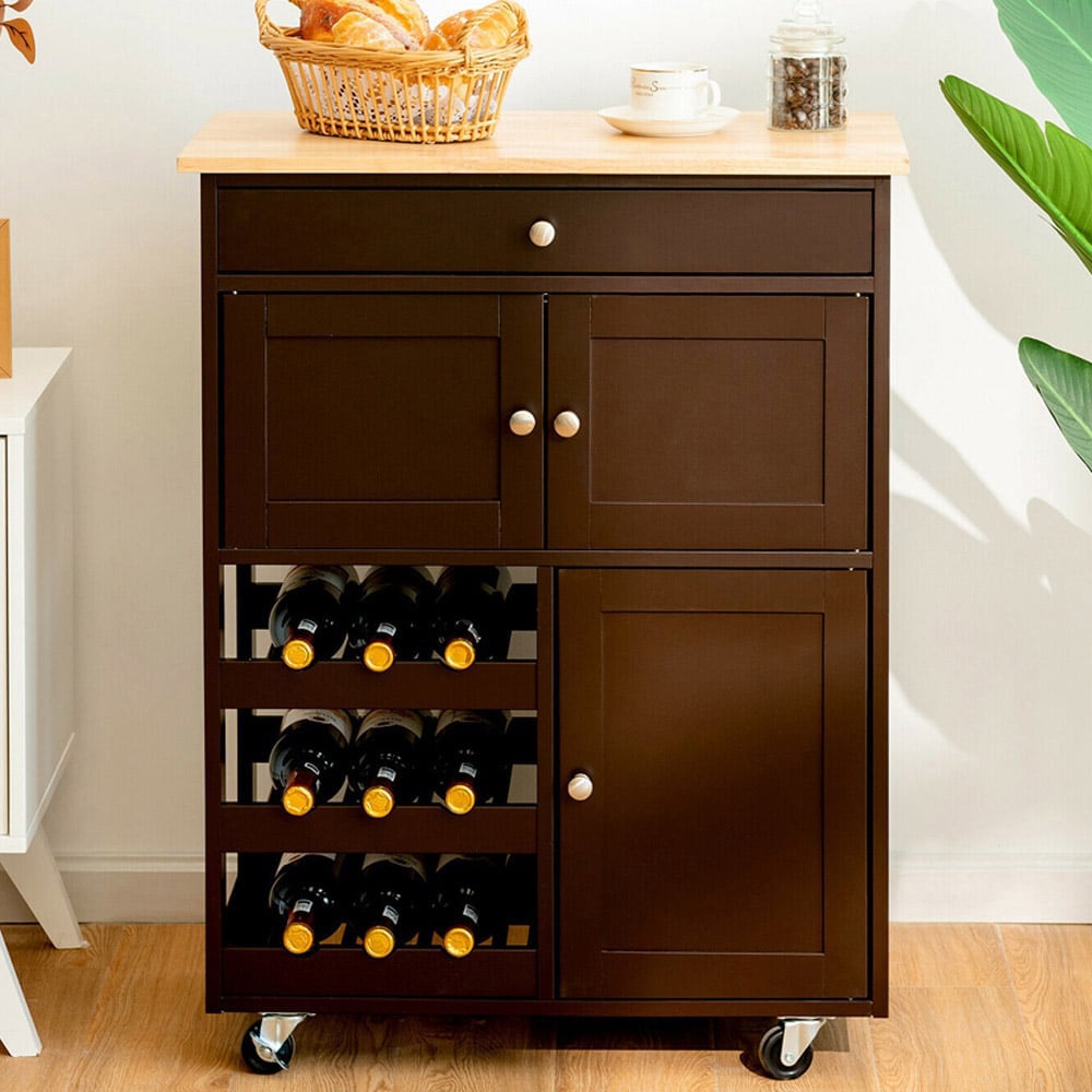 Costway 3 Door Single Drawer Brown Kitchen Trolley Cart
