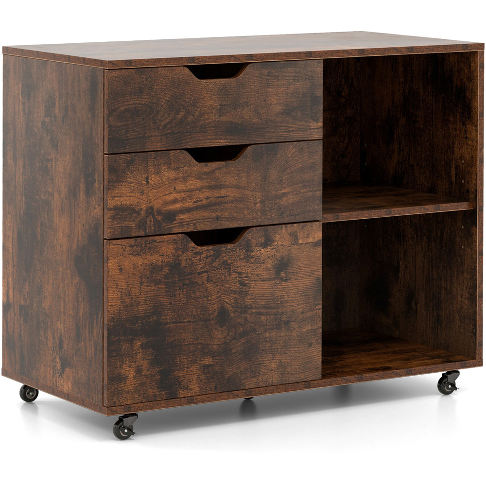 Elevate your workspace with the sleek and versatile Costway 3 Drawer 2 Shelf Rustic Brown Mobile File Cabinet. It is a perfect blend of style and functionality. This multifunctional piece not only serves as a filing cabinet but also doubles as a printer stand, offering three spacious drawers and a five-position adjustable shelf to cater to all your organizational needs. The top drawer features adjustable hangers suitable for letter, A4, or legal-size files, ensuring your documents are always in order. Effortless mobility is provided by smooth-rolling wheels, with two lockable ones for added stability, making it easy to move the cabinet wherever it's needed. Whether used in a professional setting or as a stylish addition to your home office, this cabinet promises to keep your space clutter-free and organized.