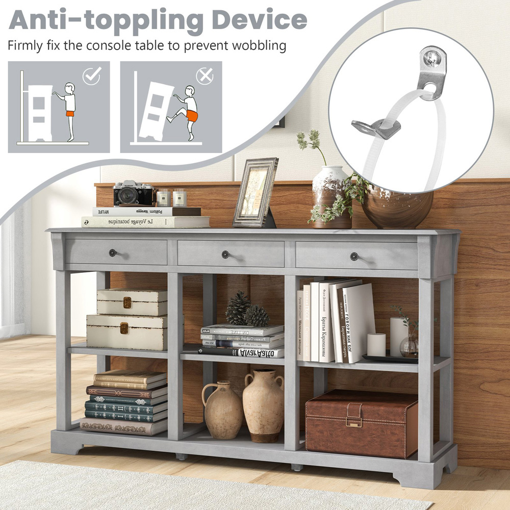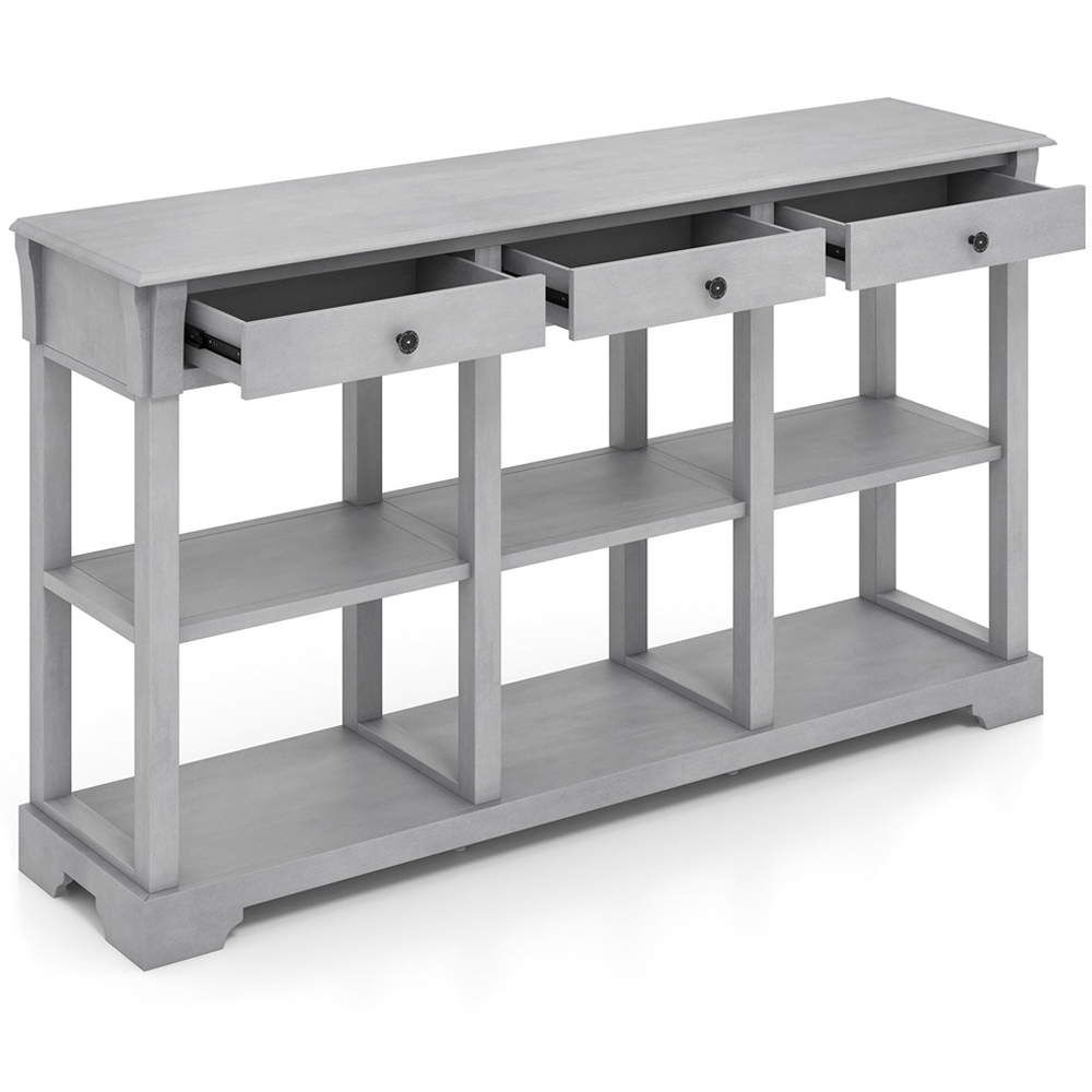 Step back in time with the Costway 3 Drawer and 2 Shelf Grey Retro Console Table. Features the blend of vintage design meets modern functionality. This grey console table not only enhances your living space with its classic distressed look and decorative features but also offers a practical solution with its ample storage options. It includes a wide tabletop, three drawers, and a two-tier open shelf, perfect for organizing everything from daily necessities to decorative items. Built with solid wood legs and equipped with an anti-toppling device, this table promises excellent durability and stability. Whether placed in your entryway or as a stylish accent in your living room, this piece is sure to add a touch of retro charm and meet all your storage needs.