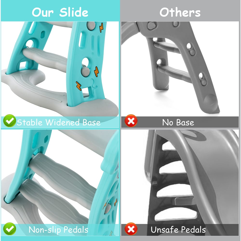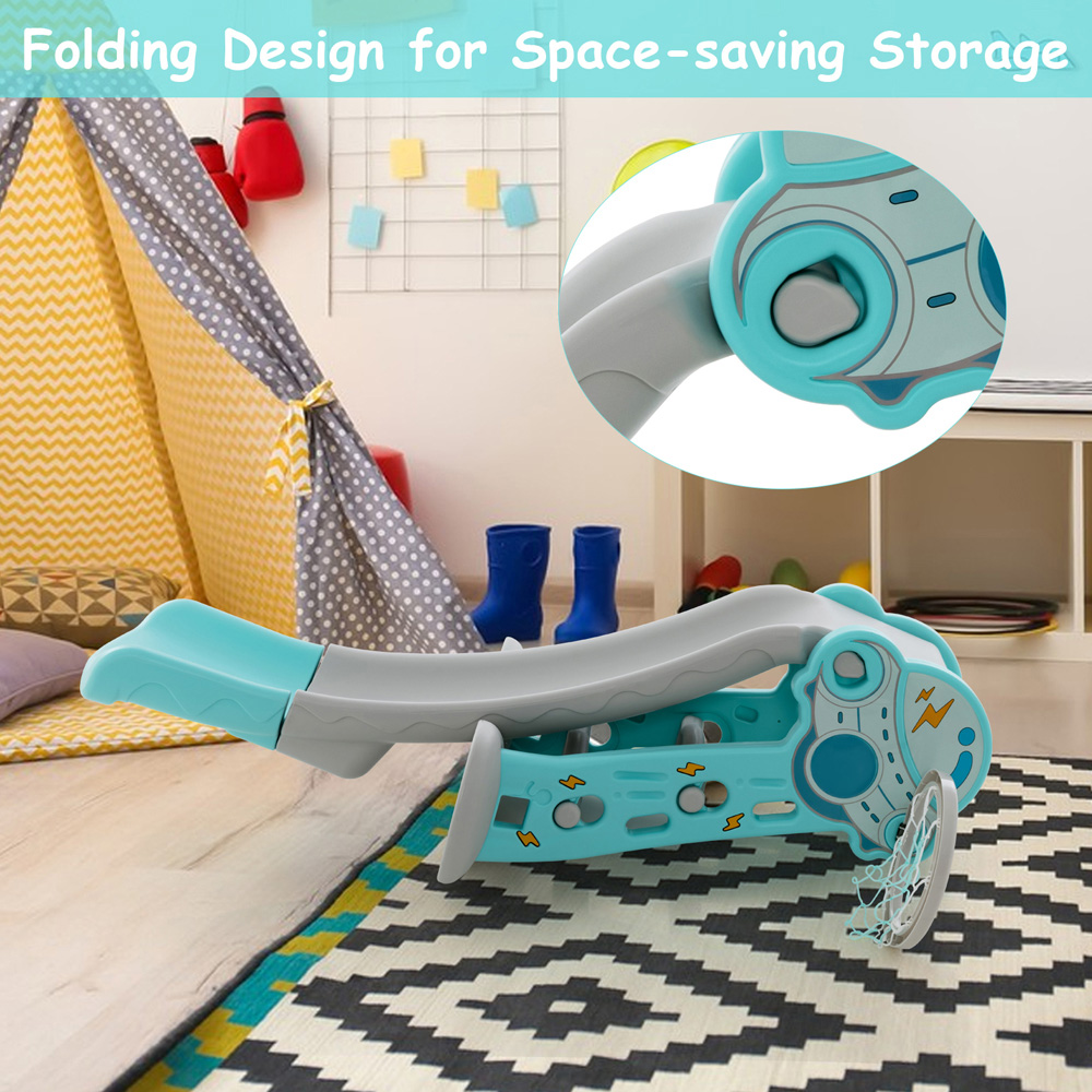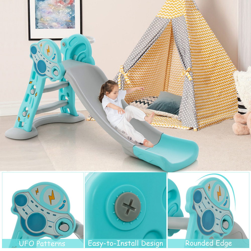 Encourage active play with the Costway 3 in 1 Blue Kids Indoor Slide with Basketball Hoop. This versatile playset features a wide slide, a basketball hoop complete with a small ball, and climbing steps, providing various play options to engage child’s imagination and develop their motor skills. It is crafted from high-quality HDPE material, that is BPA-free and odourless to protect kids’ delicate skin and safety. This play slide is designed for durability and safety, ensuring it can withstand active play while being free from harmful substances. The slideway includes a considerate buffer zone to ensure smooth play and safe landings, while the stable widened base and non-slip pedals make it sturdy, safe to climb and not easy to wobble. The rounded edges and burr-free surface prevent accidental bumping or scratching. Suitable for children aged 18 months and older, this slide’s eye-catching UFO patterns and bright colours are sure to attract any child’s attention. The slide is also designed for convenience, featuring a foldable design that allows for easy storage in compact spaces, making it ideal for use in living rooms, kindergartens, and nurseries. The sturdy triangular structure supports up to 44 lbs, ensuring stability during play, and the easy-to-grip nuts simplify installation. The smooth surface can be quickly wiped clean for hassle-free maintenance, making it a practical choice for busy parents.