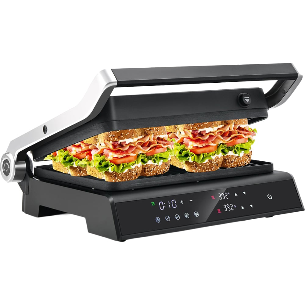 The ideal answer to all your culinary requirements. Featuring 180° flat double grill plates, this electric grill is ideal for indoor BBQ gatherings with family. Thanks to its floating lid design, it accommodates any thickness of food for uniform heating. This electric panini press grill comes with five automatic preset temperature and time configurations tailored for different meals. Additionally, the upper and lower grill plates can be heated independently, enabling the preparation of diverse dishes simultaneously. Moreover, the grill includes five automatic cooking modes (vegetables, eight minutes at 200℃/392℉; sausage, 10 minutes at 220℃/428℉; fish, eight minutes at 210℃/410℉; chicken, seven minutes at 230℃/446℉; beef steak, eight minutes at 230℃/446℉), which can significantly conserve your time and energy. The electric indoor grill highlights a user-friendly LED touch control panel. You can effortlessly press the button to set the heating temperature and a timer ranging from 0-4 hours. With a high-quality stainless steel heating element, this 1200W electric panini press grill heats up swiftly. Furthermore, the floating hinge allows the top lid to be lifted to evenly press sandwiches of various thicknesses (10-50mm/0.4-2 inches). The waterproof, dishwasher-safe, and removable grill plates feature a non-stick coating for simple cleaning. Additionally, the electric sandwich maker comes with a detachable drip tray to gather excess fats and liquids during cooking. It is perfect for preparing a quick breakfast, family BBQs, picnics, and more. Lastly, the anti-scalding handle is designed to ensure your safety.