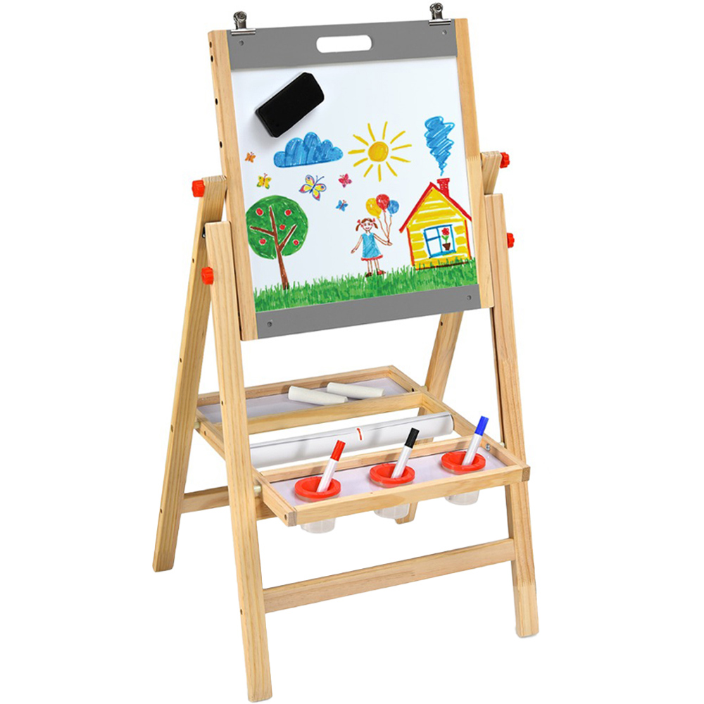 Foster a love for art in your child with the Costway 3 in 1 Grey Kids Double Sided Wooden Art Easel. It features a double-sided design with a magnetic whiteboard and a chalkboard, making it easy to switch between drawing styles. Your child can enjoy different ways to create art with the included paper roll. The easel is made from environmentally friendly MDF material, ensuring it is safe for children to use. It also has a solid pine wood frame. Providing extra stability and durability. The triangle structure keeps the easel stable while children paint and draw. The spacious storage tray allows children to keep their chalks, markers, erasers, magnetic beads and other essentials organised. Additionally, the easel comes with two-tier racks with two storage boxes, giving plenty of room for art supplies. The bright grey colour of the easel is sure to attract young artists and inspire their imaginations. It is suitable for children over three years old and encourages creativity and interaction with friends. The easel is easy to assemble with the included manual. The product dimensions are 117 x 50 x 60cm, and the blackboard/whiteboard size is 38 x 47cm. It has a net weight of ten kg. The package includes one easel, two magnetic beads, two pigment cups, one drawing paper, two storage bins, and one user guide.