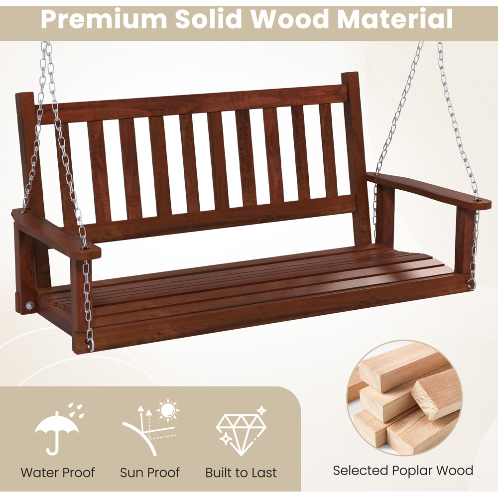 Get the ultimate in outdoor leisure with the Costway 3 Seater Wooden Adjustable Outdoor Porch Swing. It is constructed of high-quality poplar wood, which allows for great strength and bears a weight of 360 kg. The selected poplar wood is also sun proof and built to last. This outdoor porch swing features a spacious seating area for three people to sit. You can enjoy your leisure time with your family members or friends. It also includes two rust-proof metal chains to hang the porch swing. You can adjust upper chains to change height, connect with S-shaped hooks and use two sheep eye screws to fix. The length of the upper steel chains is 170 cm. Featuring a slatted backrest with inclined angle and ergonomic curved seat, this swing fits well with your body curve. It also comprises smooth armrests that offer a place to rest your arms. Thus, you can sway with utmost comfort. It comes with clear user manual and all needed accessories for effortless installation. After assembly, you can hang it on different places, including ceiling, tree or swing stand. Please note that the swing stand is not included.