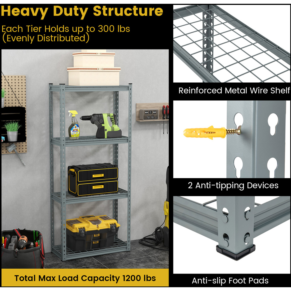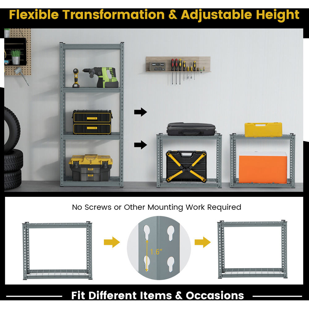 Keep your essentials easily accessible with the Costway 3 Shelf Grey Metal Garage Storage Unit. This garage shelving unit is made from high-strength and powder-coated metal, which is built to last and can provide sturdy support for all your items. Each tier can hold items up to 136 kg and also provides large storage space without taking up much floor space. You can easily adjust the shelf heights to fit your specific storage needs. The shelf can also be easily disassembled into two separate smaller units to fit different items and occasions. Designed with safety in mind, this garage shelving unit comes with two anti-tipping devices. Additionally, the bottom anti-slip foot pads are equipped to prevent any unwanted sliding or scratches on your floors. Thanks to the boltless design and detailed instructions, the assembly work of this storage shelving unit can be done effortlessly. It is recommended to use a rubber mallet with a pair of gloves for assembly (not included).