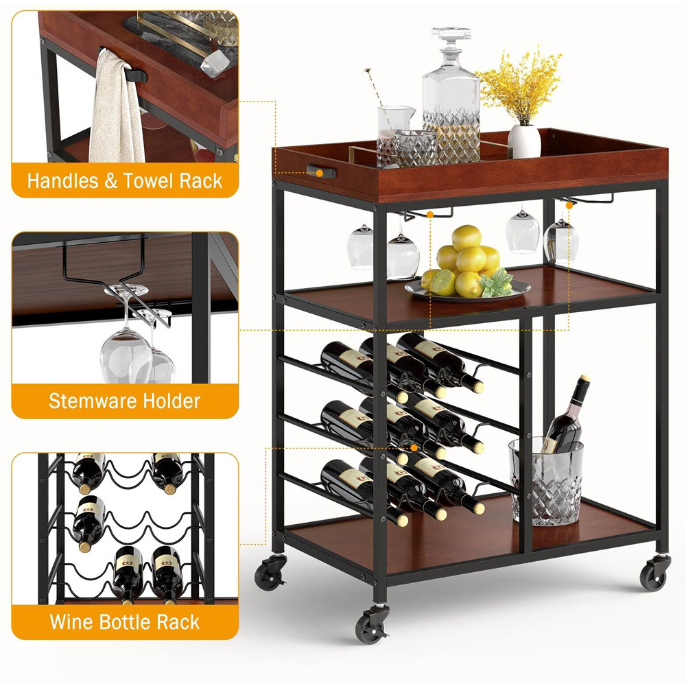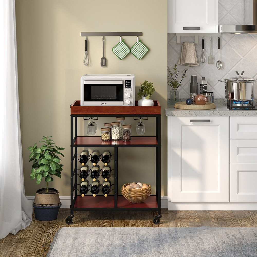 Elevate your home with the versatile 3-Tier Kitchen Island Storage Cart, a perfect blend of functionality and style. Made from premium engineered wood and supported by a heavy-duty metal frame, this durable cart is designed to last. It features three open shelves, a top wooden tray, and specialised holders including two rows for glasses and a three-tier wine rack with safety guardrails to keep your bottles secure. The cart is equipped with four smooth-rolling wheels, two of which are lockable, ensuring easy movement and stable positioning wherever needed. Its chic, industrial design complements any decor, making it an ideal choice for kitchens, dining rooms, and bars. Not only does it offer ample storage and easy mobility, but it also doubles as a stylish serving cart for entertaining.
