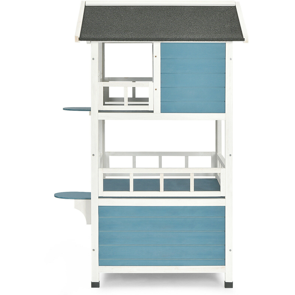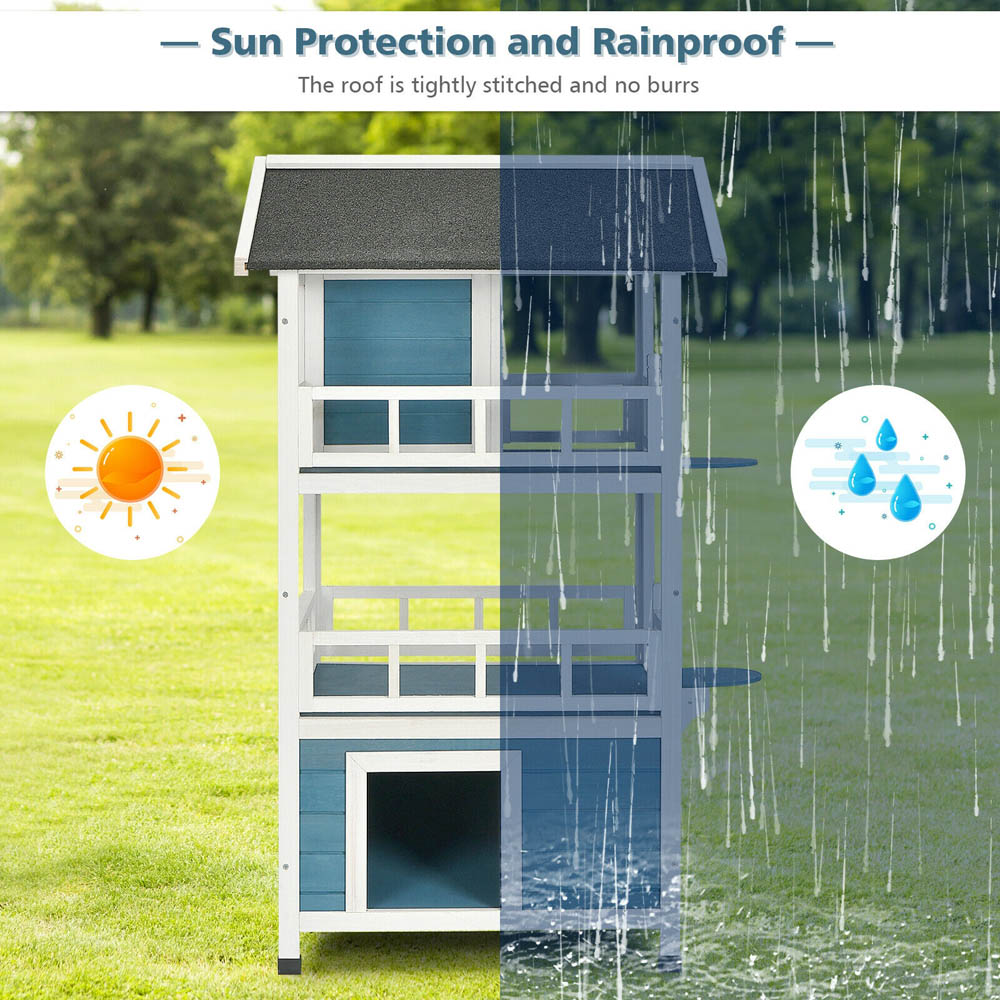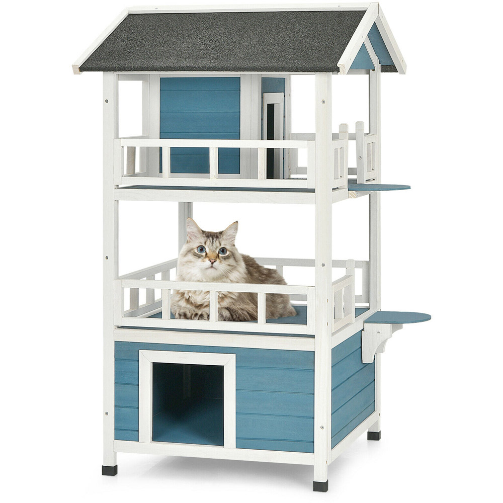 Give your feline friend their very own cosy spot with this adorable Costway 3 Storey Wooden Cat House with Enclosure. With three levels, your cats can lounge, climb, and have a blast in their personal space. It's elevated off the ground with plastic feet to avoid rotting, making it a stylish addition to your garden, porch, or even inside your home. Crafted from high-quality fir wood and an engineered wood frame, the tongue and groove panels fit snugly to keep out the elements. Plus, the balconies are topped with a slanted asphalt roof for extra protection. Assembly is a breeze with clear instructions and all the necessary hardware included. Thanks to the waterproof coating, it requires minimal upkeep.