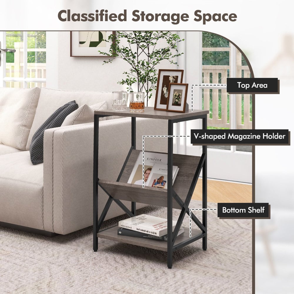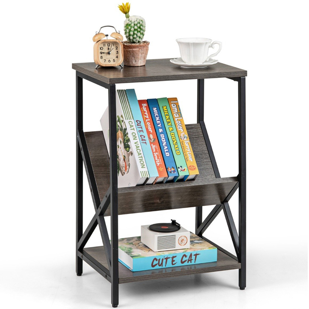 Elevate your living space with the sophisticated Grey 3-Tier Record Player Stand, featuring a unique V-shaped magazine holder that blends functionality with style. This versatile piece serves not only as a stand for your record player and vinyl collections but also as a chic magazine rack, adding a touch of elegance to any room. Crafted with a beautiful wood grain finish and a robust black metal frame, it offers multiple shelves for optimal organization and is perfect for use in living rooms, bedrooms, or studies. Its compact dimensions ensure it fits neatly in smaller spaces, while the adjustable foot pads protect your floors and enhance stability.
