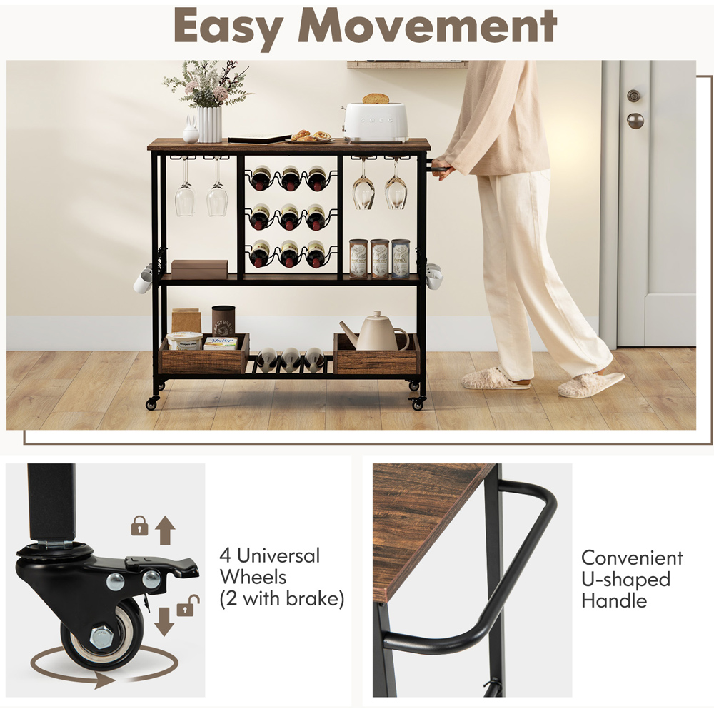 Elevate your home entertainment with the Rustic Brown Bar Cart on Wheels, a perfect blend of functionality and style. This 3-tier liquor cart not only keeps your wine and glasses within arm's reach but also enhances your space with its rustic and elegant design. Equipped with lockable casters, the cart offers both mobility and stability, allowing you to serve your guests effortlessly in any room. The additional storage features, including a spacious tabletop, open compartments, side hooks, and bottom boxes, provide ample space to organize all your essentials. Whether stationed in the kitchen, dining room, or living room, this mobile bar cart adds a timeless charm while keeping your favourite vintages always accessible.